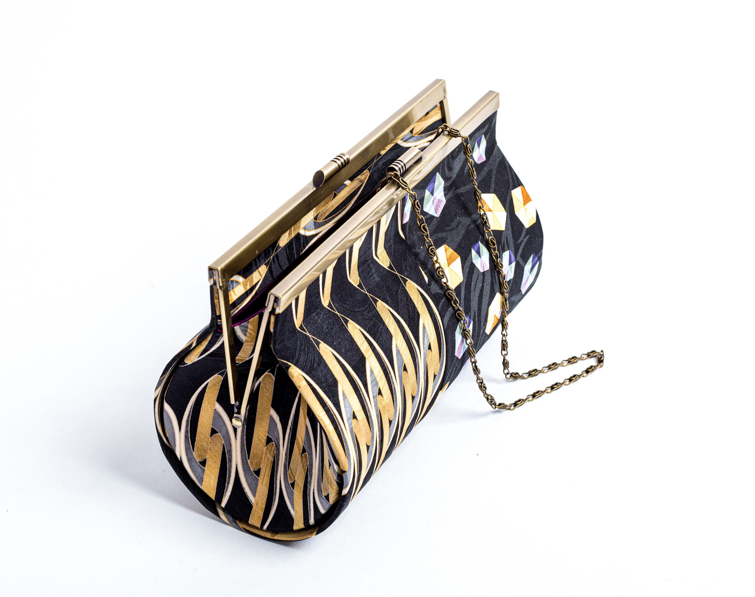 reclaimed neckties, molded pressboard base, purchased antique brass kisslock frame and chain strap 8" x 6" x 4"
