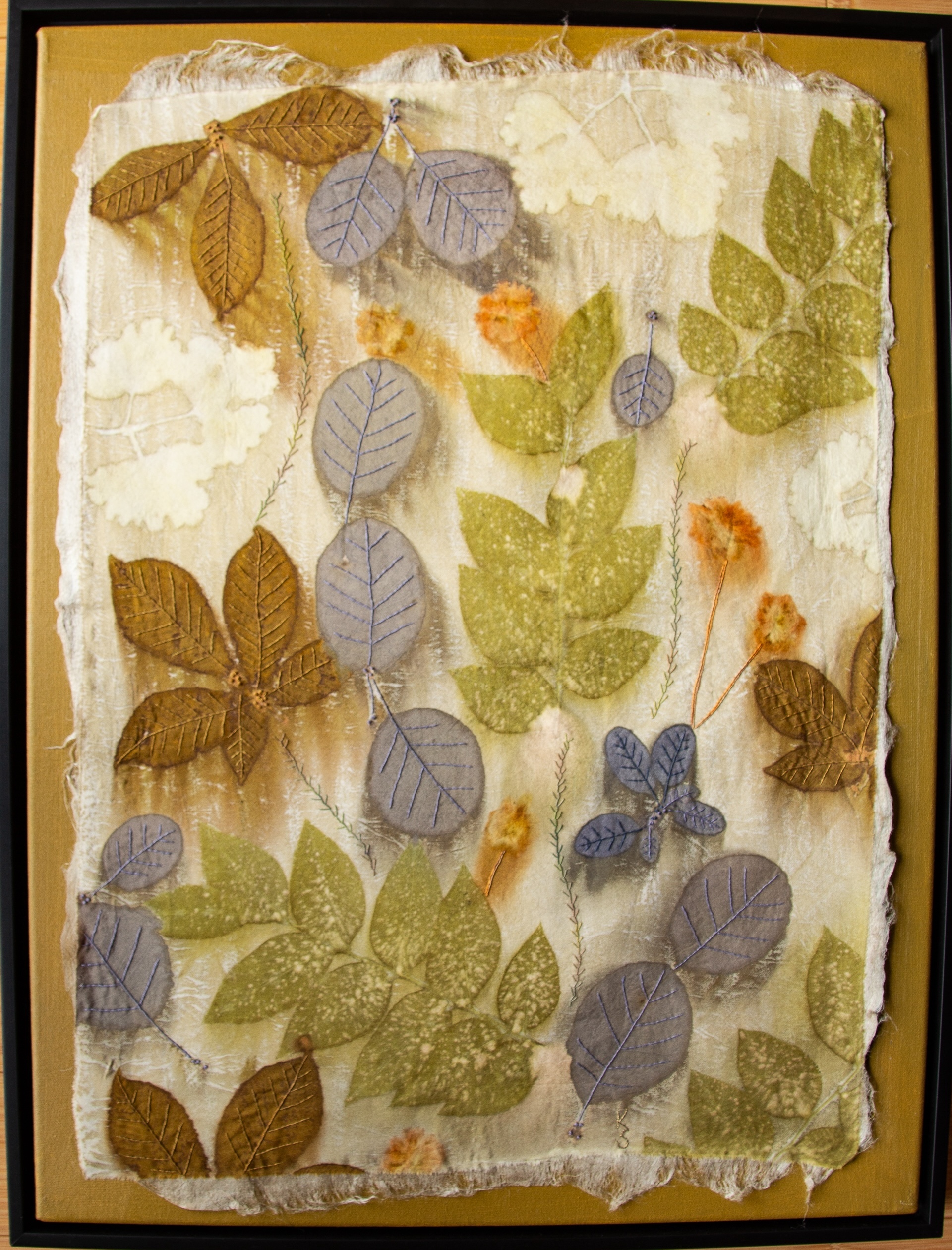 All flora holds the perfect mixture of science, magic and beauty. With minerals, tannins and alchemy I endeavor to coax the spirit of plants onto silk cloth, releasing their own pigments, no dyes are used. Botanicals are laid on treated cloth, rolled tightly around a dowel, bound with a cord and steamed to release the plants juices, creating a light fast print. The printed silk cloth is fused onto silk fusion creating a backing. Handstitching embellishes the work