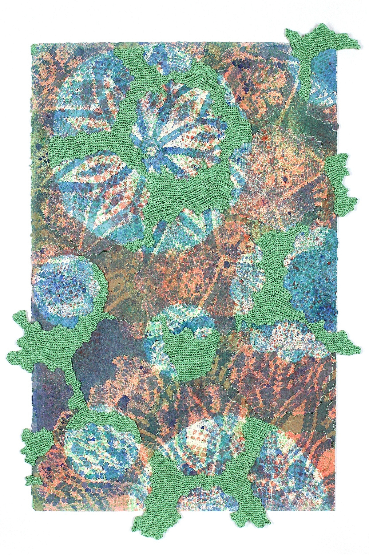 In the Memory series, paint is sprayed through and over antique, vintage, and artist made crocheted doilies. After the paint is applied, found fibers are then stitched and crocheted onto the paper substrate, breaching and altering its surface and edges. The doilies, originally recognizable objects, become distorted and inverted in the paint layers. Manipulated into new forms or altered by physical fiber stitches, the compositions re-create the doilies in a different medium. These distortions mirror how we relate to the past: we forget, remember incorrectly, recall certain pieces clearer than others, and evolve the event as we remember and retell it. The inversion, distortion, and alteration of the doilies with paint and fiber illustrate how memories will never be the actual event or even very reliable, but confined to being only an echo of it, or as an imprint that has been filtered and edited.