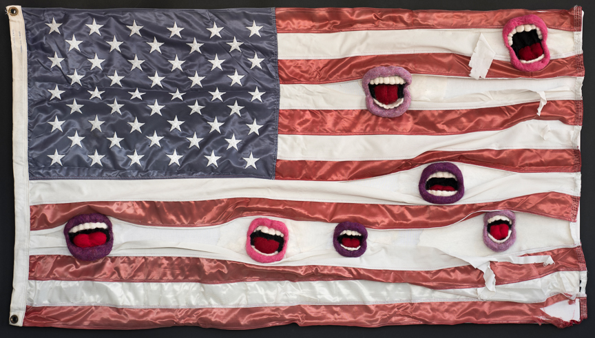 Behind this naturally-distressed American flag, emerges the words of the constitution and Bill of Rights phototransferred on tea-stained organza, and needle felted screaming mouths. It is my response to the erosion of civil rights under the Trump administration.