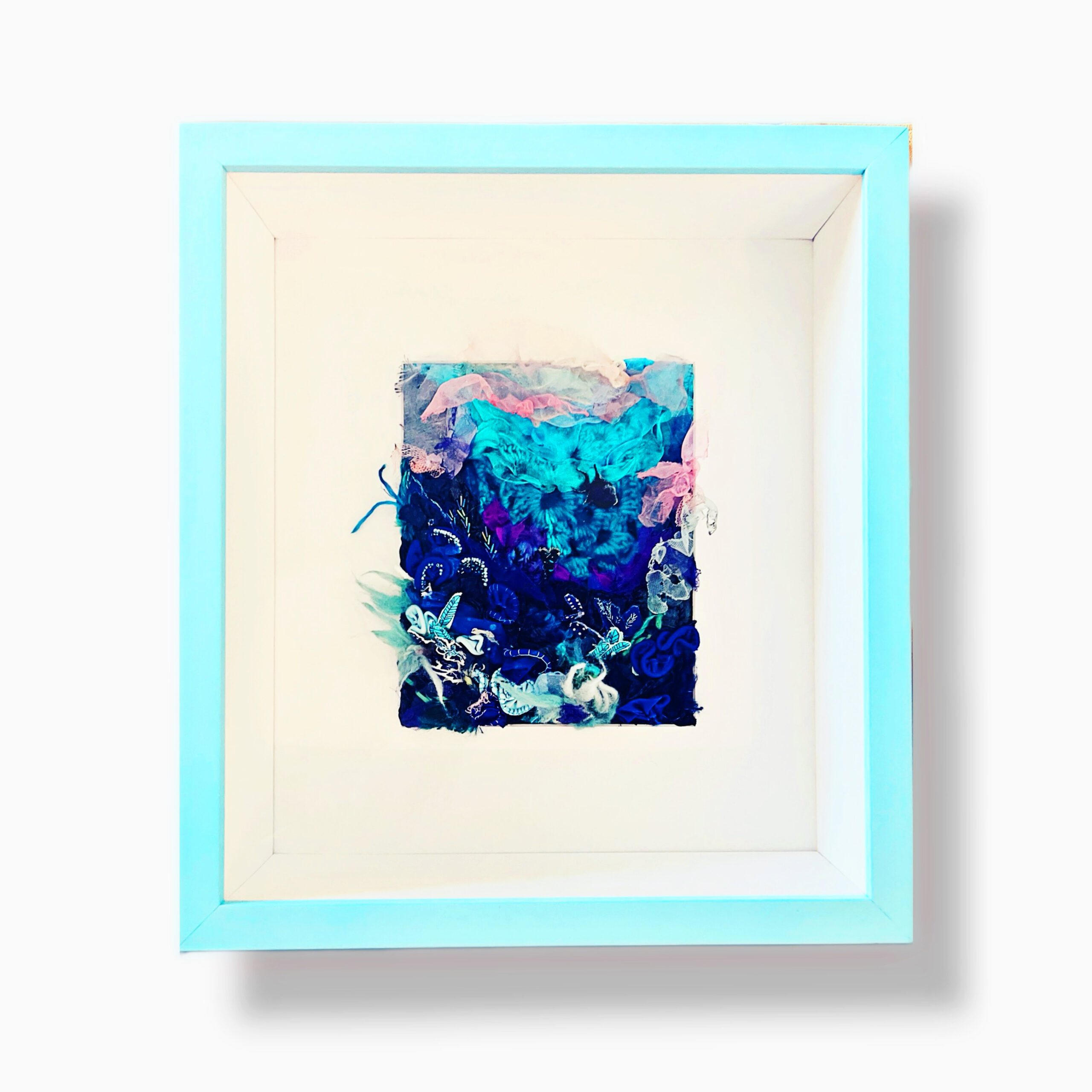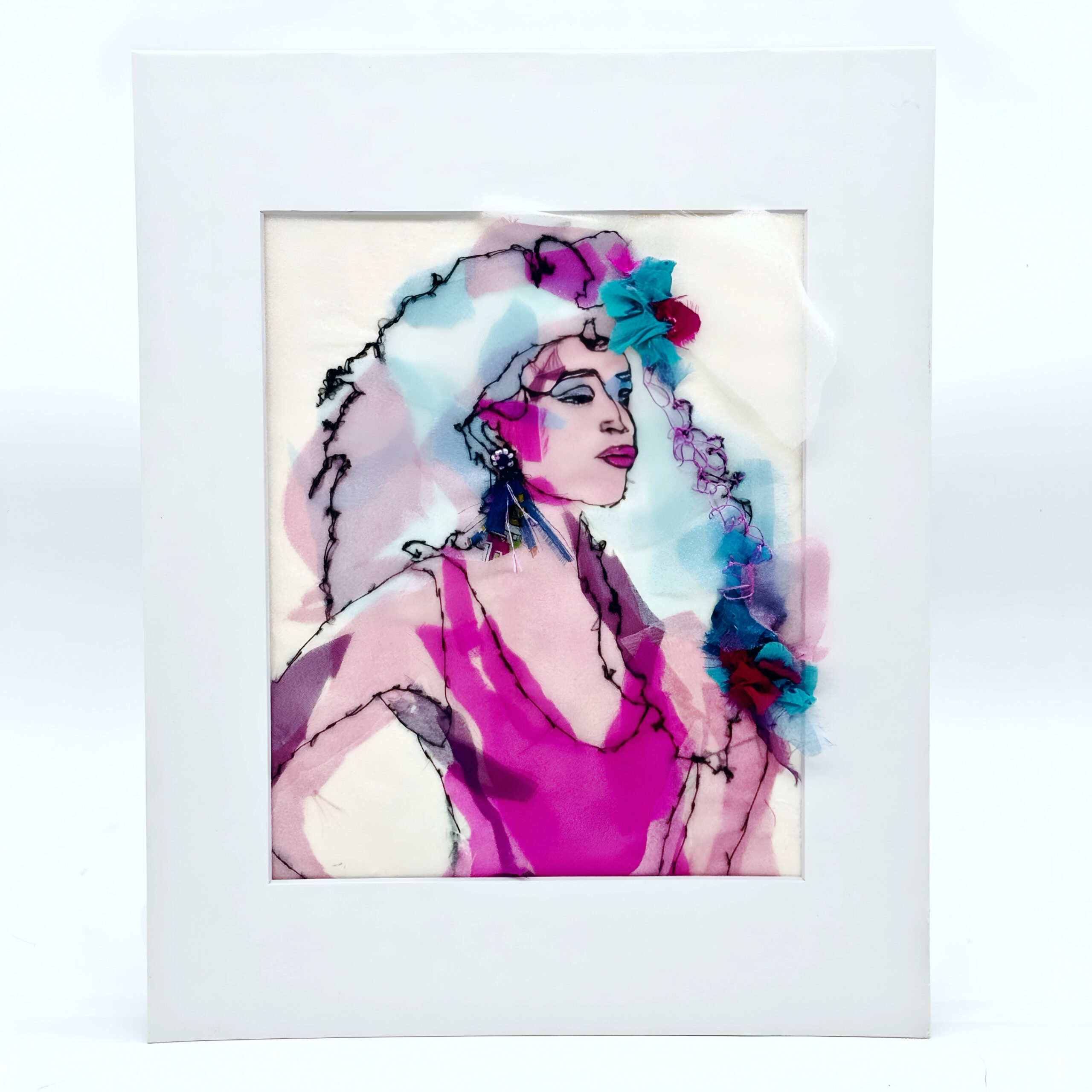 Textile collage with beadwork and embroidery on chiffon, organza, silk, and upcycled clothing, mounted on cotton rag paper. 14” h x 11” w x 1” d