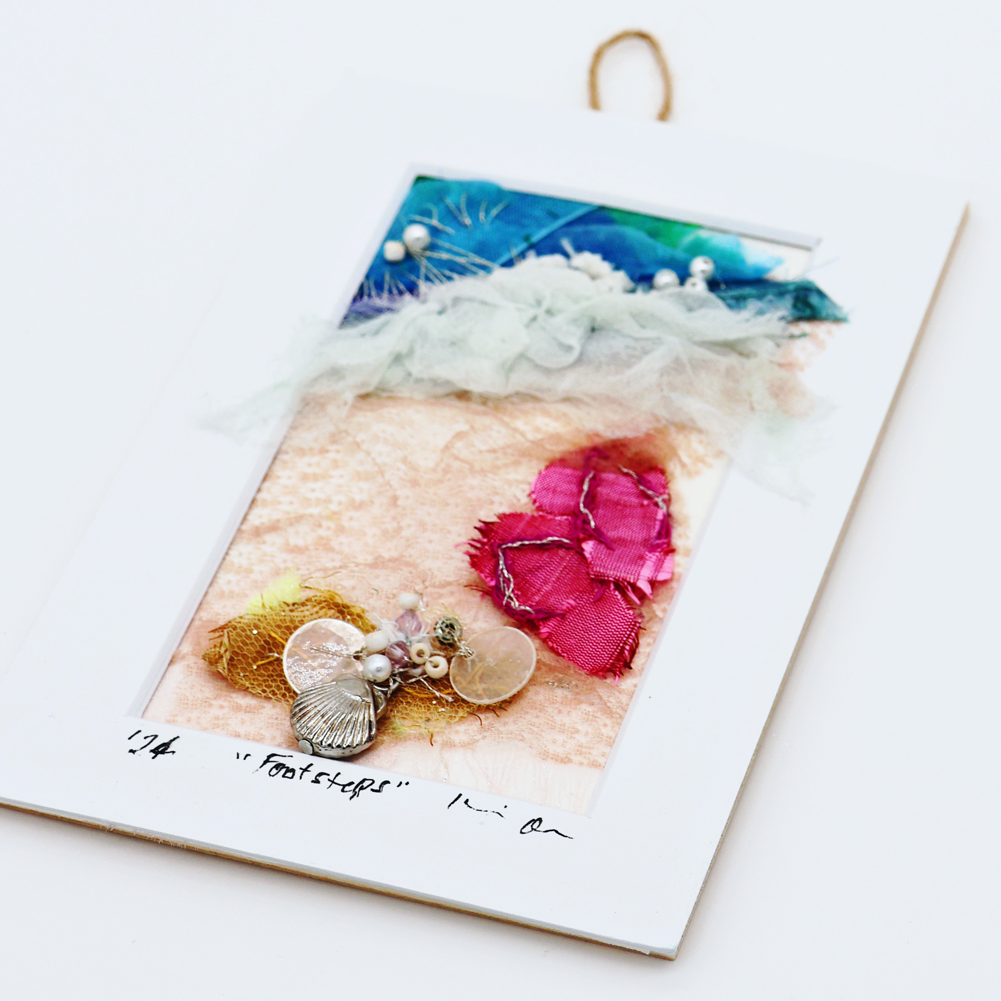 Just a tiny ditty of a textile collage featuring a pair of pink, dupioni, raw silk sandals, surfside. Along with found objects and beads, this mini textile collage packs a punch with texture that explodes out of the mat! Literally!
