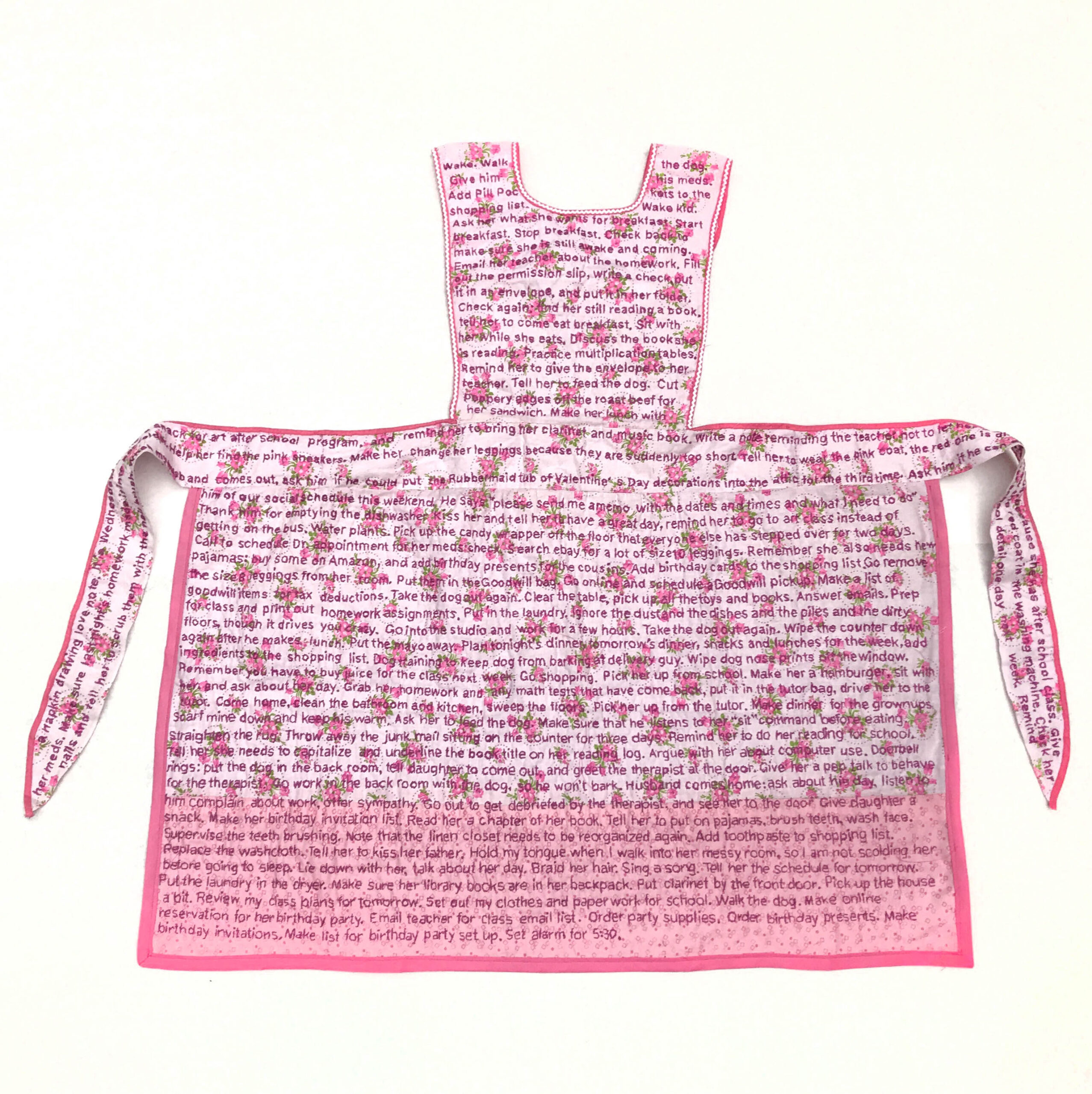 hand embroidery on vintage apron, detailing one day of emotional labor 30 x 45" (variable)