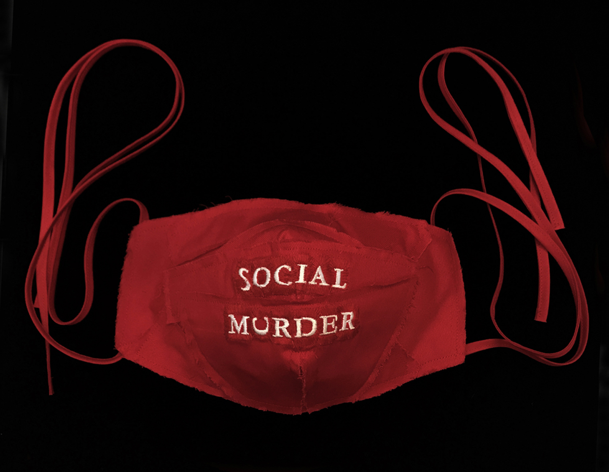 From the MAGA Hat series. I cut up individual MAGA letters and pieced them together to make the new text on a mask made from deconstructed MAGA hats.. "Social Murder" is a term coined by Friedrich Engels referring to the unnatural death that occurs due to social, political, or economic oppression. "The class which at present holds social and political control"... "places hundreds of proletarians in such a position that they inevitably meet a too early and an unnatural death," In this case, Trump's approach to/denial of Covid.