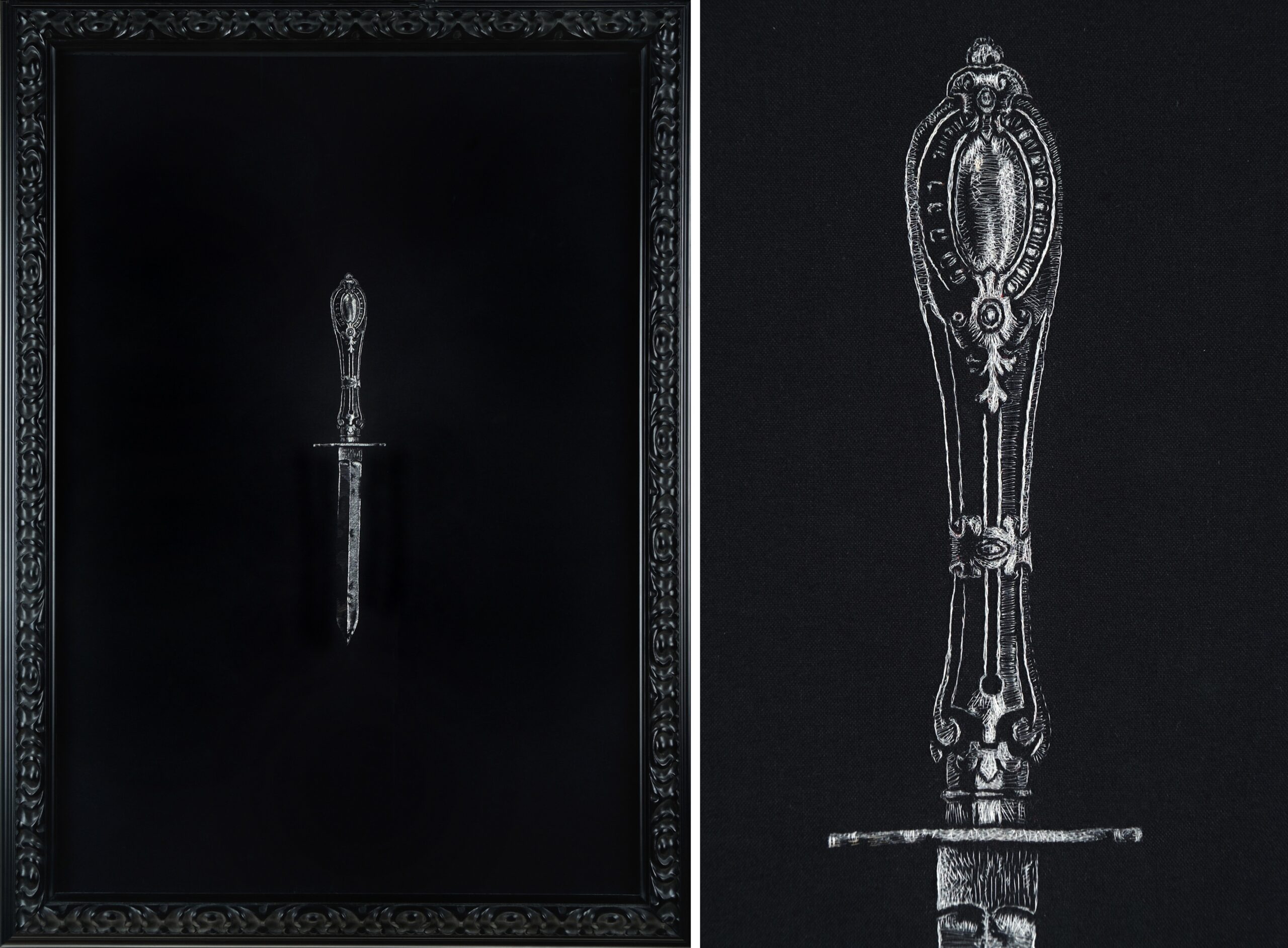 Hair is like the rings of a tree, it records illnesses, stress, pregnancy, etc. I crowd-sourced the grey hair of many women, and hand-embroidered a silver dagger on black cotton.