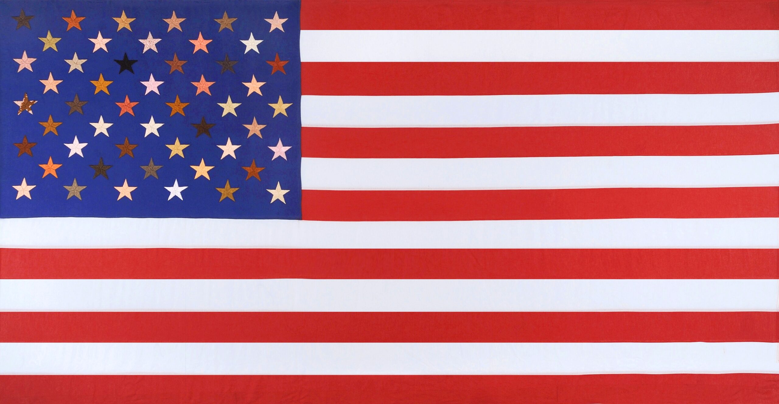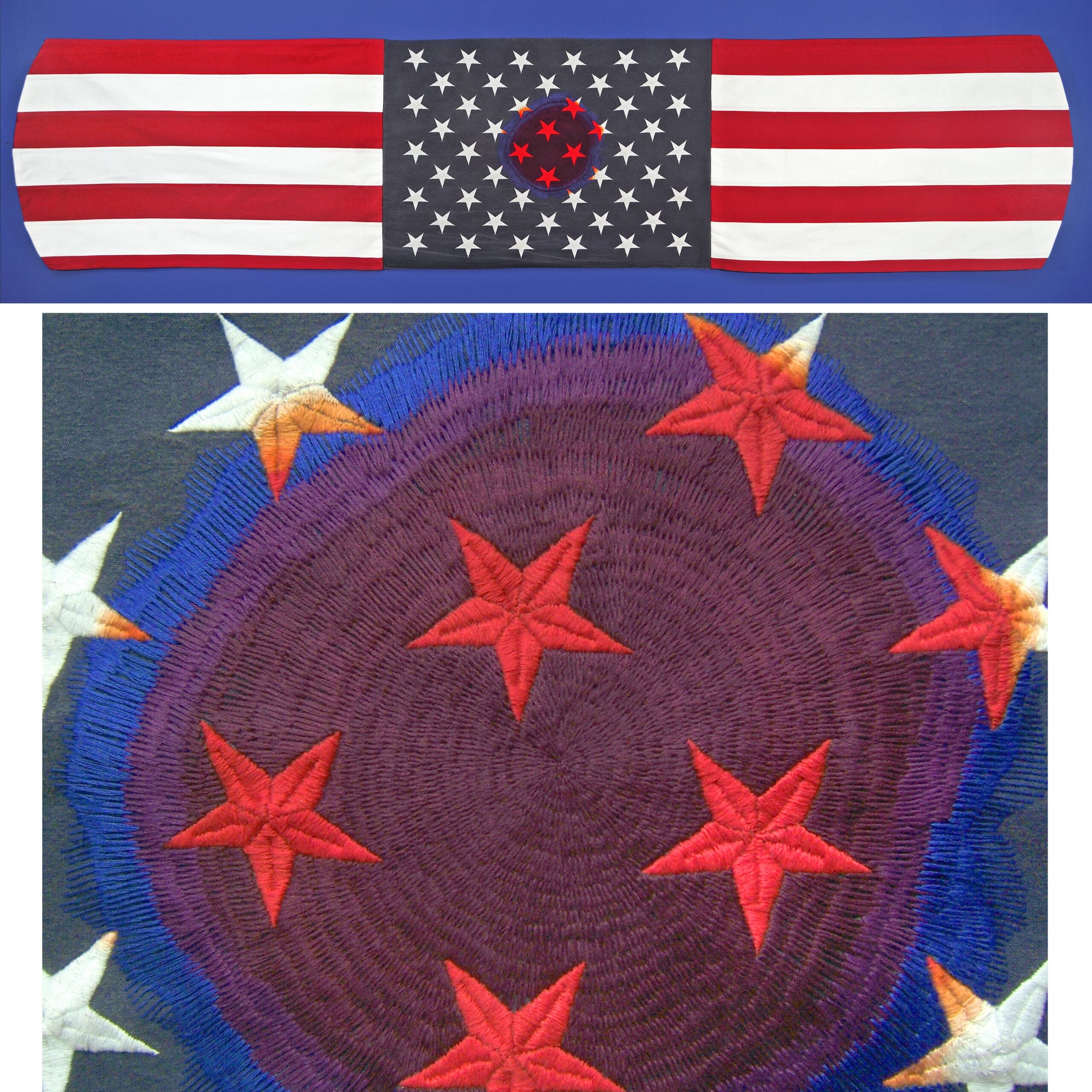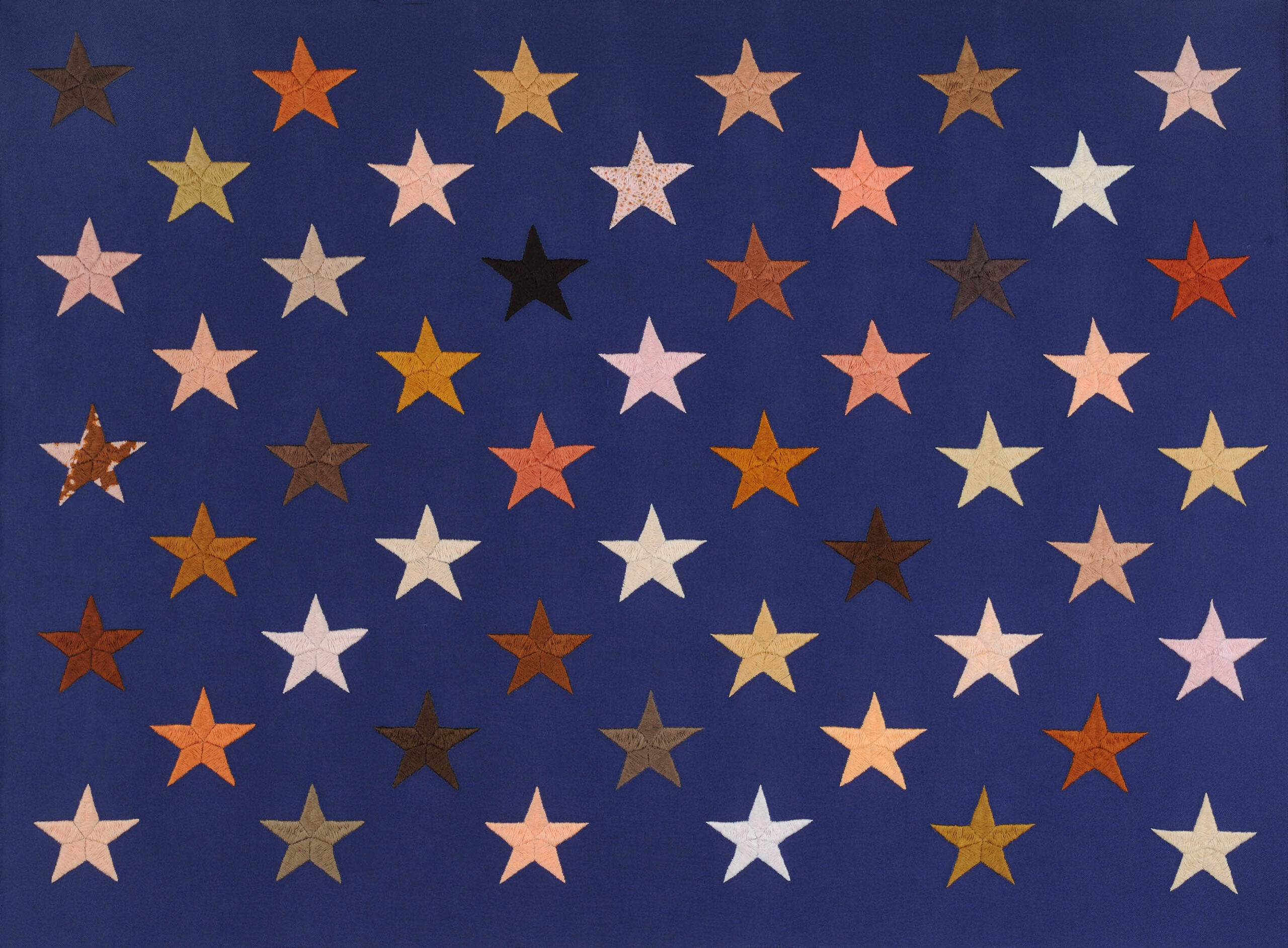All the machine-embroidered white stars were ripped out and replaced with hand-embroidered stars representing all the melanin scale skin tones of U.S. citizens. 550-hour project.