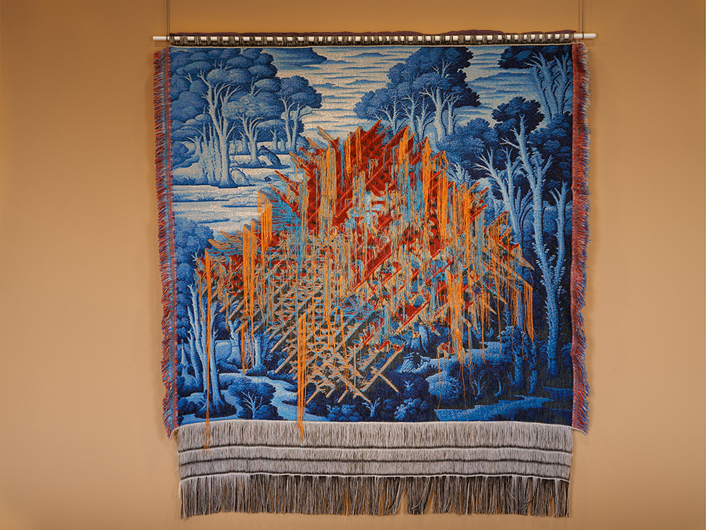 Hybrid II is a tapestry in which the varied colors and patterns evoke visual and textural contrasts. The landscapes and symbols derive from 16th-century Gobelin tapestreis depicting apocalyptic battles between good and evil. This work is apart of the series of tapestries in which the artist examines reltionship between digital and traditional weaving.
