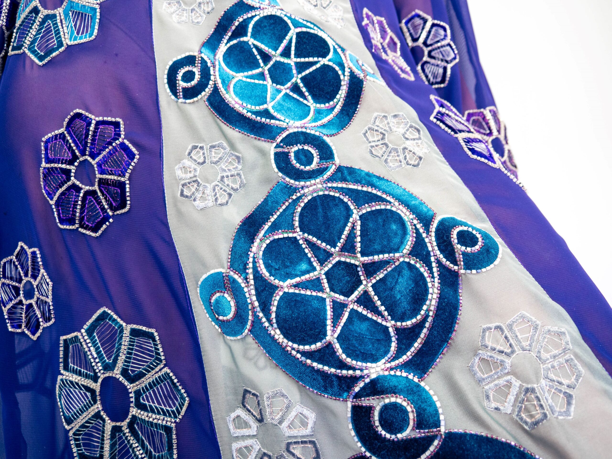 Chiffon, velvet, beads, metallic threads, hand embroidery this is a pattern