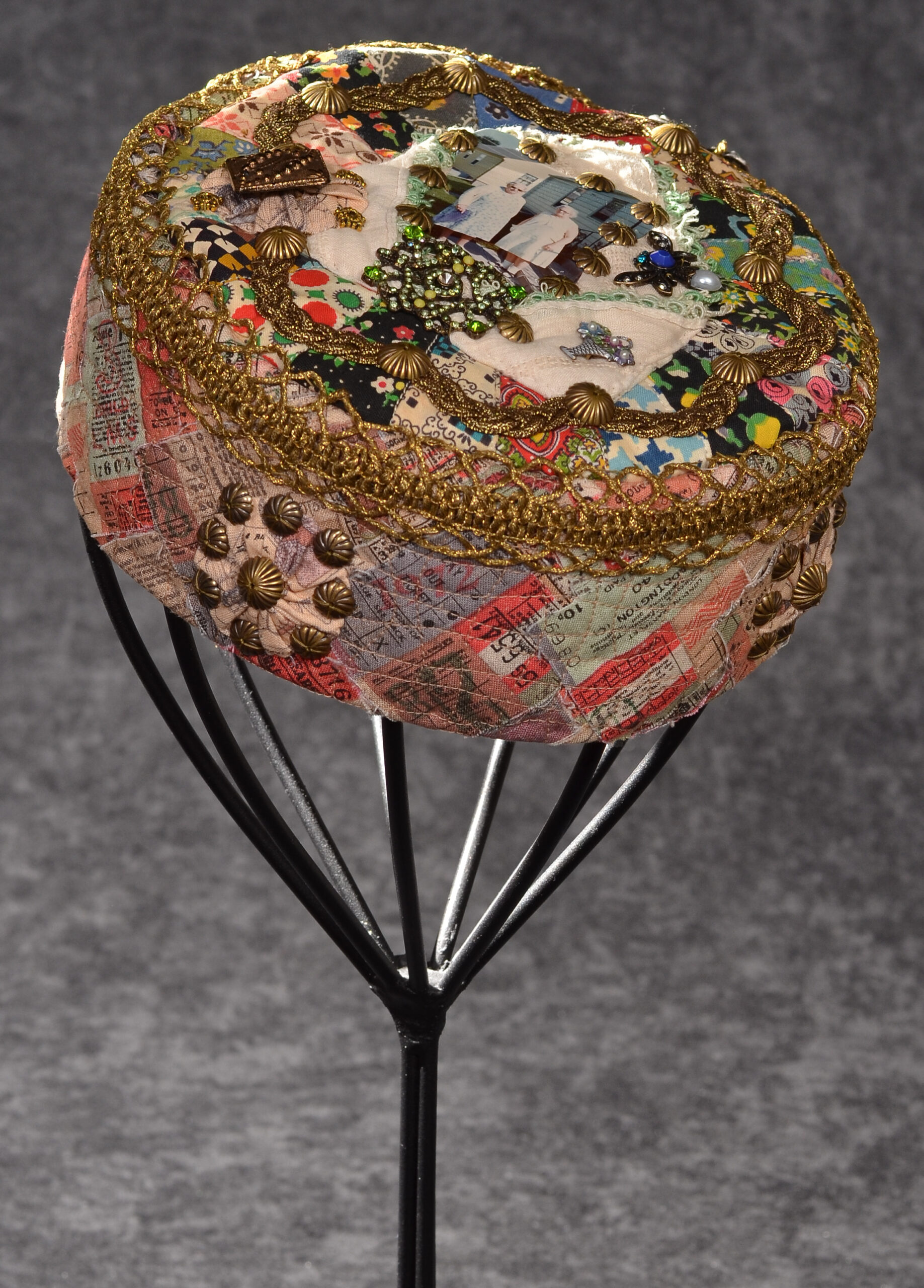 A pillbox hat dedicated to my Grandma-K who taught me the art of sewing. Designed incorporating her potholder, handkerchief, jewelry and photograph. Her hanky was tea-dyed and manipulated to border her photo, giving the appearance of an opened envelope. Vintage trim with beaded yo-yos and recycled jewelry completes the surface design.