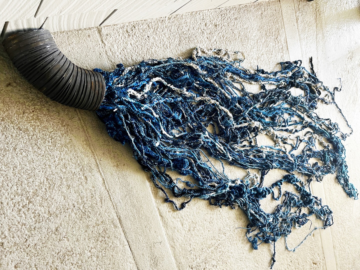 Bits of plastic embedded into strands of crocheted and braided fiber emerge from a culvert, depicting the surface runoff that is a source of the microplastics polluting our waters.