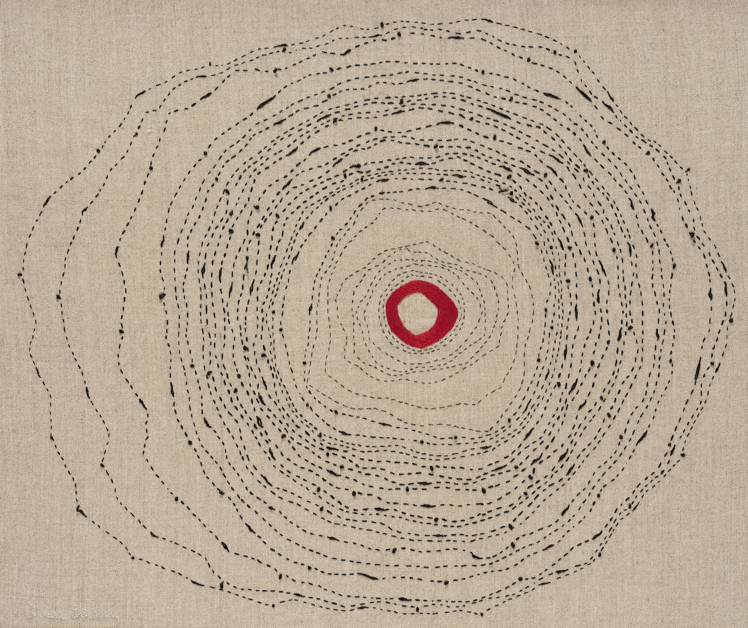 During the pandemic lockdown, I discovered and read books and articles describing the amazing traits of trees--that trees have their own DNA, that the forest is really a family with mother trees and offspring. I learned about the symbiosis of all parts of a forest and found it to be a spiritual truth. In “Family Tree”, through free-motion embroidery on my trusty Bernina, I’ve stitched tree rings, which can reveal everything about a tree’s life. To the right of the rings, I’ve hand-embroidered legends from my own family tree.