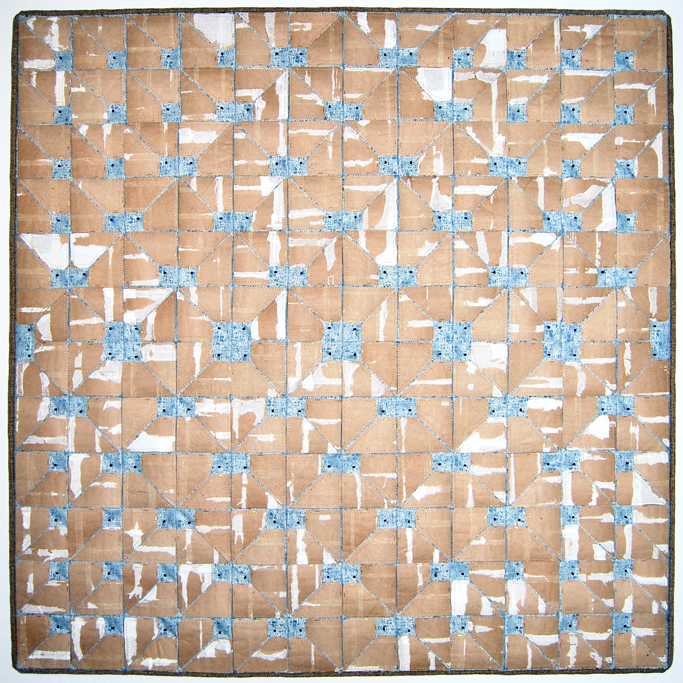 Fabric, toilet paper tubes, staples, found beads, thread, batting 38 x 38