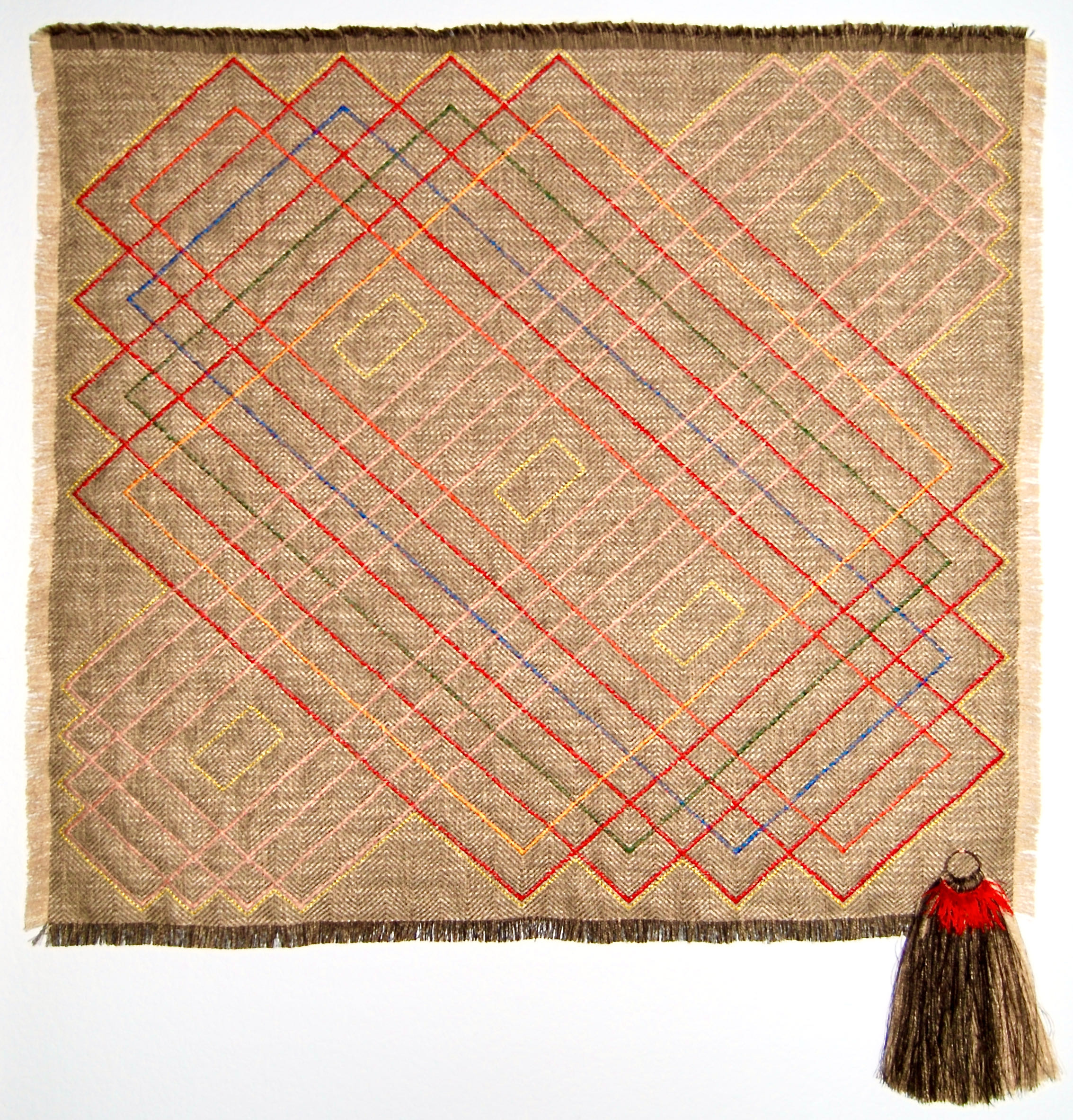 Found fabric, found metal ring, embroidery floss, thread, wool batting 37h x 35w inches