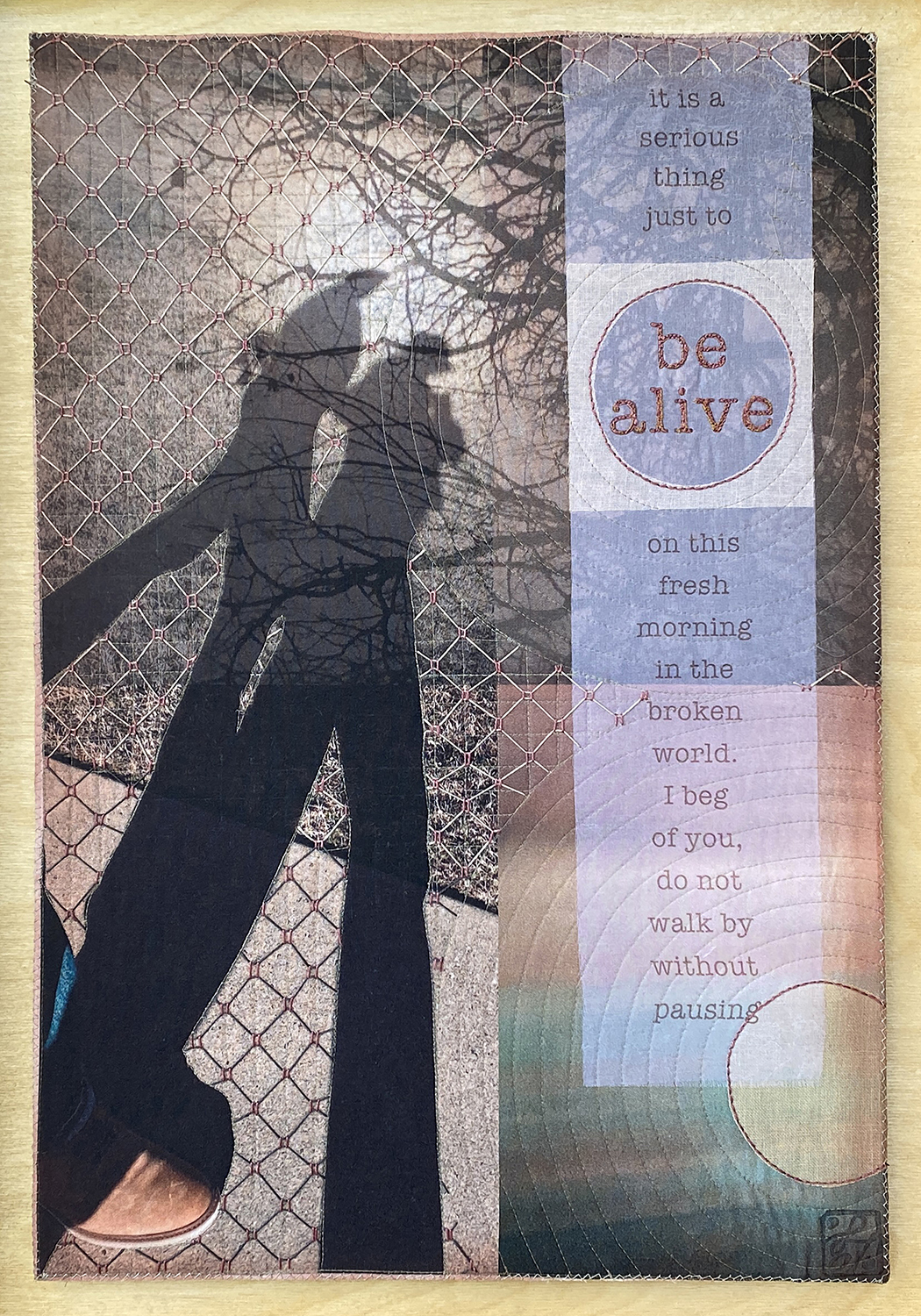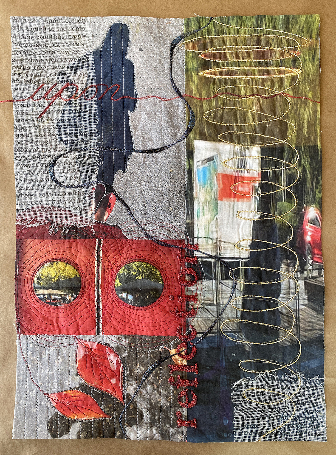 Photos printed on cotton, words printed on organza, pearl cotton thread 18x24