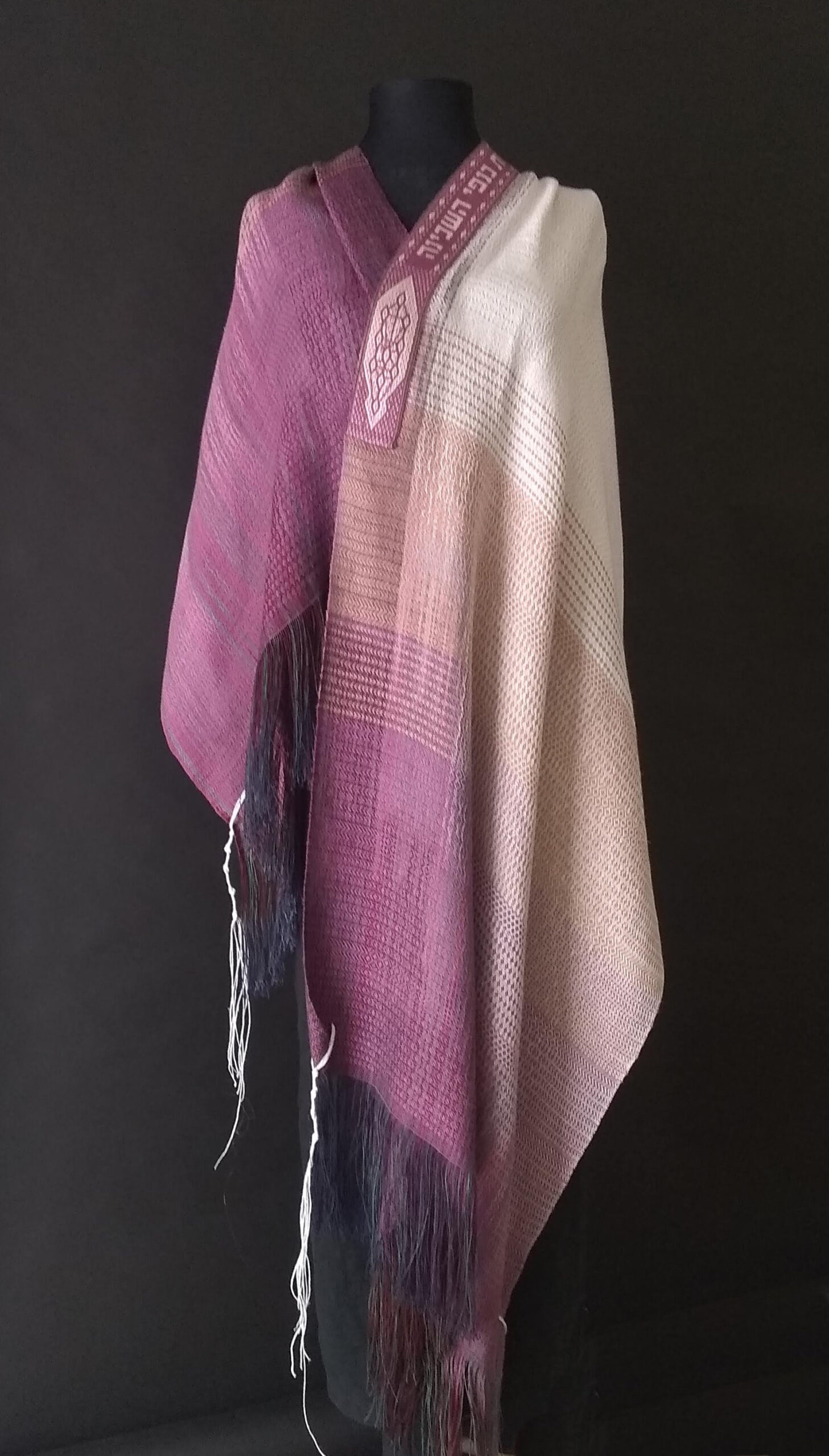 Woven on commission. Neckband has the Kabbalah tree of life glyph on each end. Hebrew text translation: 'Under the Wings of Shekhinah' (divine feminine)