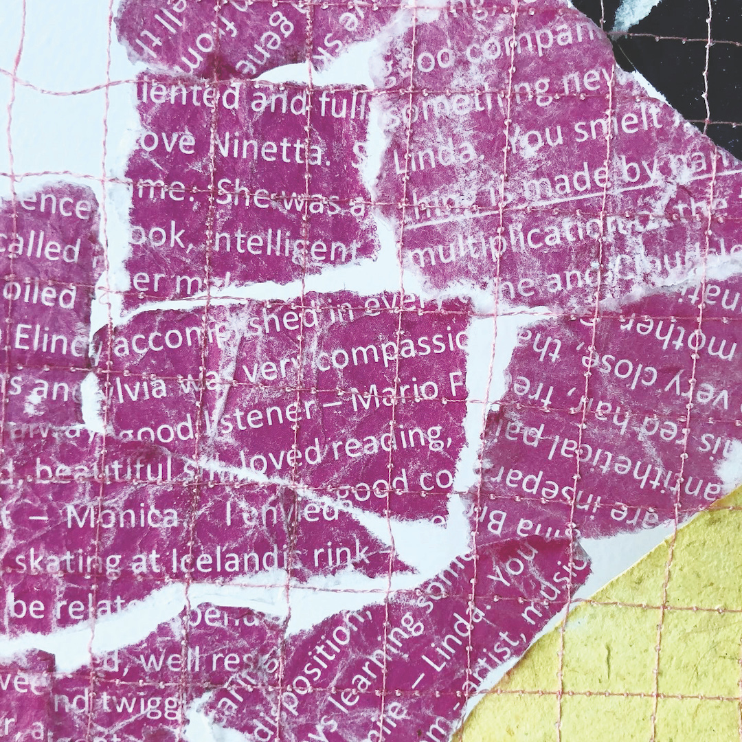 My aunt was a weaver, bookbinder and papermaker. Before she died, she gave me a large collection of her handmade papers. To honour her memory, I’ve used these papers to build and stitch her likeness in four portraits, eight including the shadows they cast. They are inspired by Andy Warhol’s screen prints of famous women. Family members sent me stories, words and phrases in her memory and I have torn and stitched them into the background of each tapestry. One tapestry now resides in my mother’s home. The other three are with my aunt’s children and serve as a reminder of her legacy.