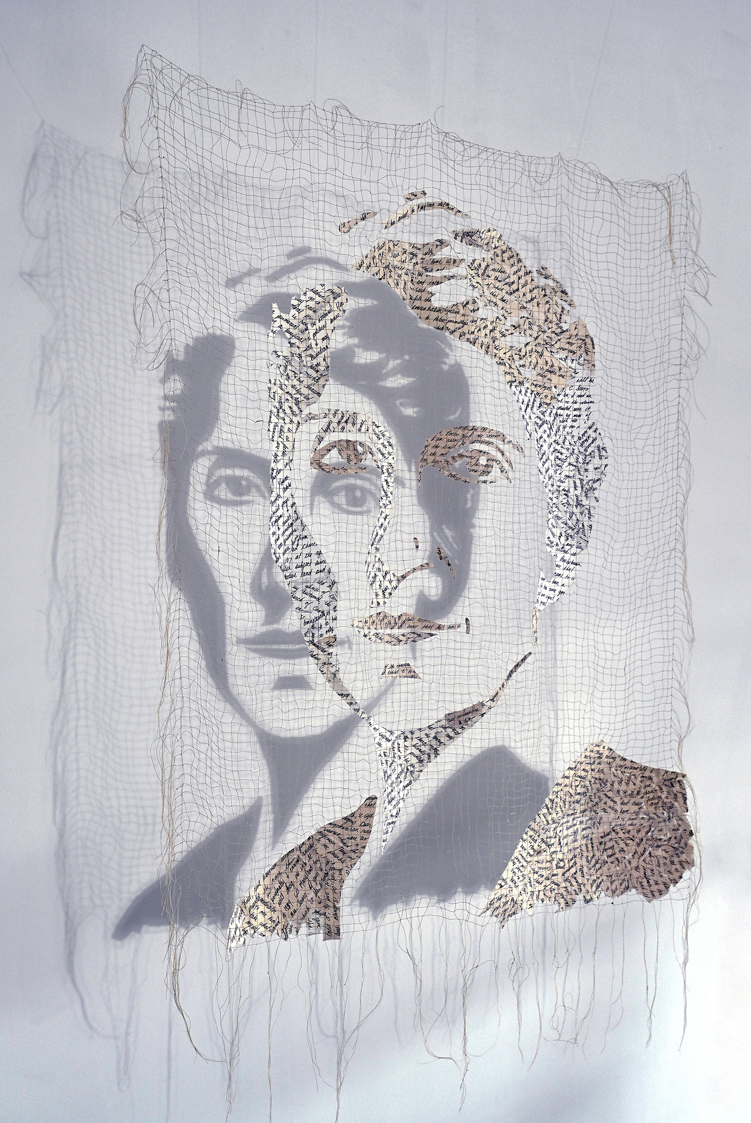 My grandmother was the stepmother to my grandfather’s five oldest children who served the Canadian Armed Forces during WWII. She had four children with my grandfather making nine in total. She was a musician, an artist, a schoolteacher and an Italian Canadian who worked tirelessly writing letters to government officials advocating for the release of my grandfather, Reverend Libero Sauro from an internment camp in Ontario, Canada during WWII. I transcribed her letters tore them up and stitched them back together to create her portrait. This creative process is a metaphor for healing and moving forward from the past with compassion and forgiveness. Her image comes to life in the shadow, like a ghost from the past.