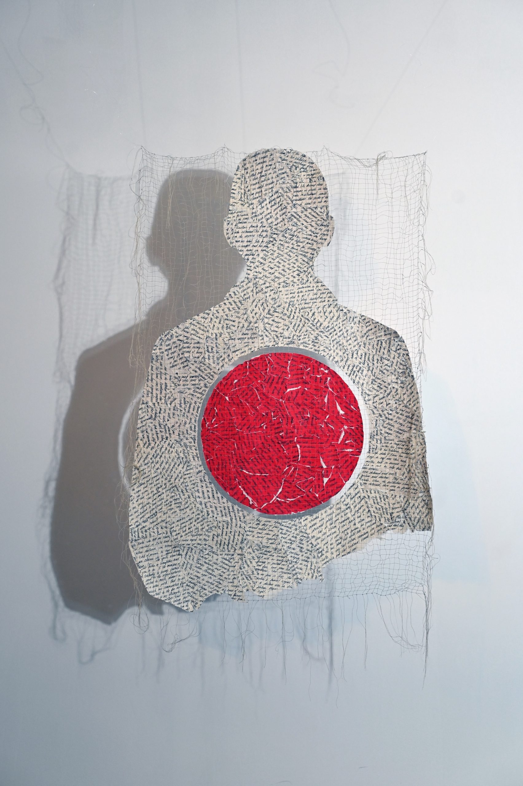 The Reverend Libero Sauro, my Italian Canadian grandfather was interned during WWII in Ontario, Canada. He was wrongfully accused of being a fascist sympathizer. The uniform of each interned prisoner included a red circle stitched on the back, a target in case an internee tried to escape. The transcribed text in this piece comes from Prime Minister Justin Trudeau’s address to parliament (May 27, 2021), apologizing to the Italian Canadian community for the internment of 600 Italian Canadians. This silhouette was created by tearing through the apology and stitching the fragments back together. My process is a metaphor for healing and moving forward from the past with compassion and forgiveness. Of the 600 internees, no one was ever charged with a crime against the state.