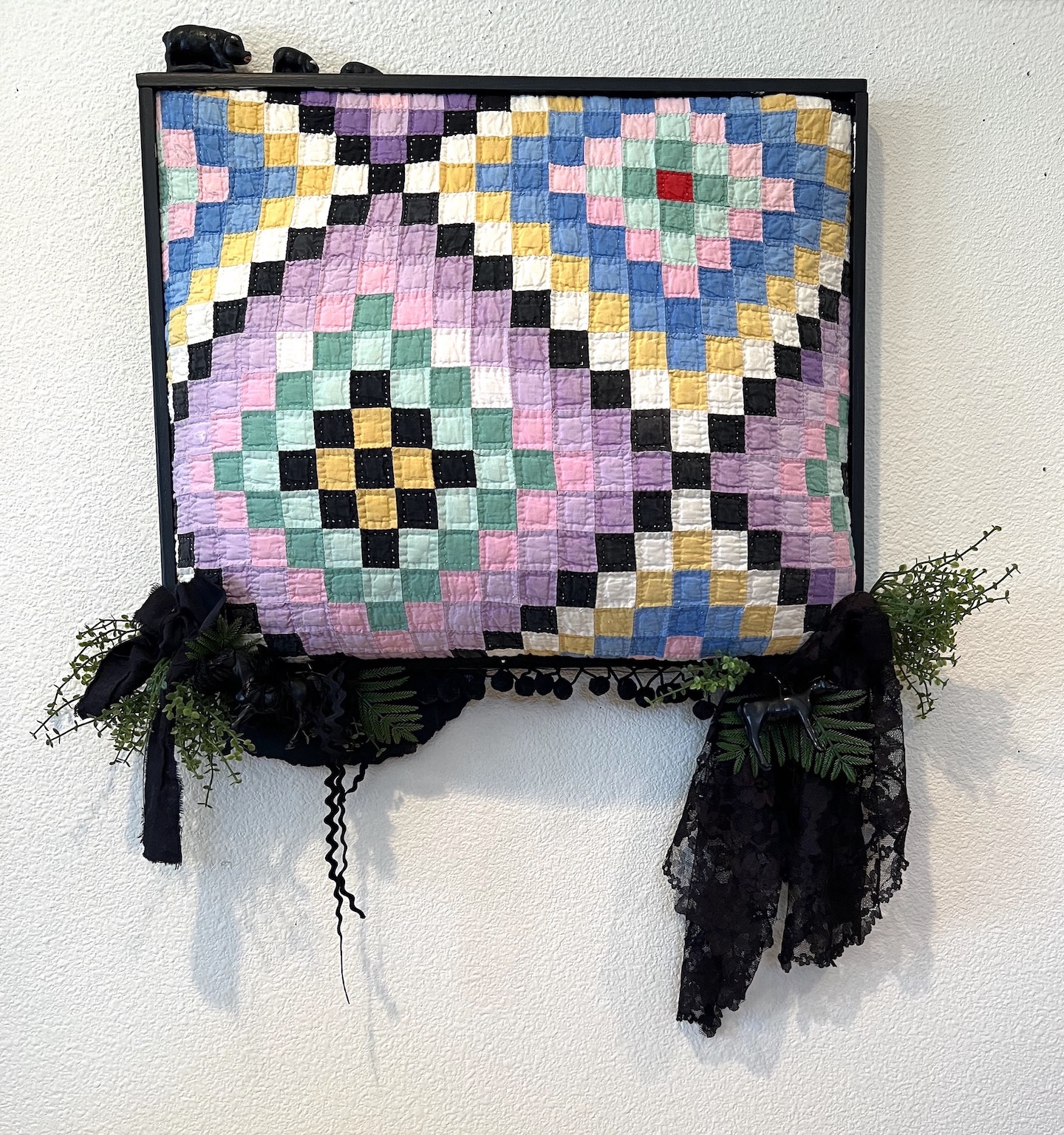 altered found quilt (Postage Stamp pattern), wood, tarpaper, vintage lace and trims, foam, found plastic plants and toys 29 x 29 x 5"