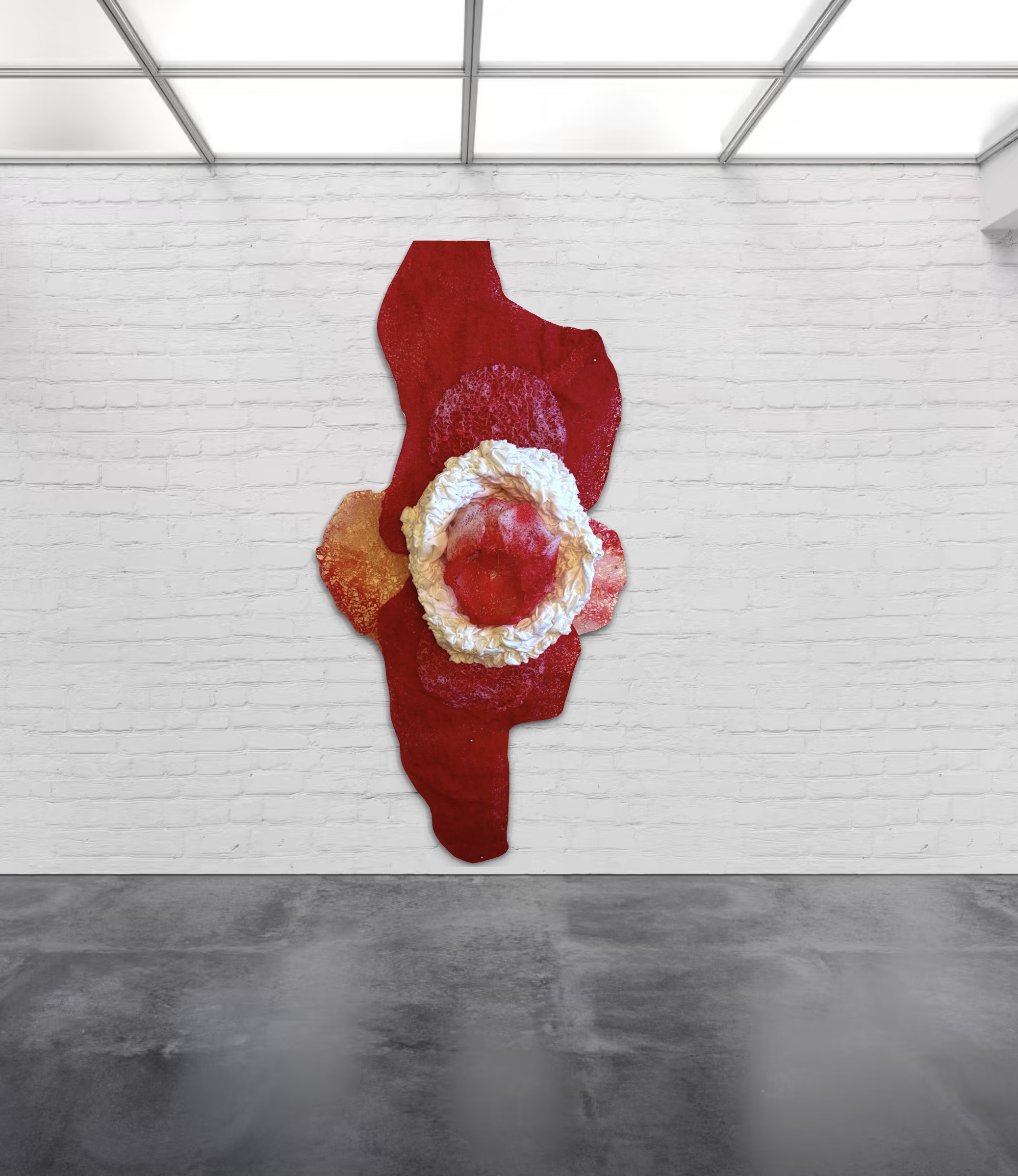 A lot visceral red fiber sculpture unfolding like a living organism, where soft, layered textures converge into a luminous, womb-like core that radiates warmth and transformation.