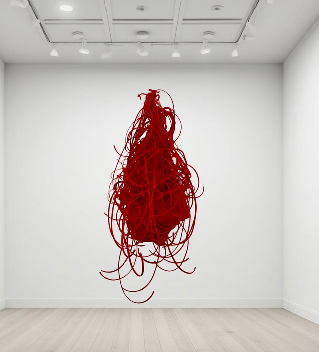 Portal of Flame suspends a turbulent mass of crimson fibers that seem to pulse between chaos and creation. This sculptural form acts as a threshold, inviting viewers to step into the intensity of transformation and the fire of renewal.