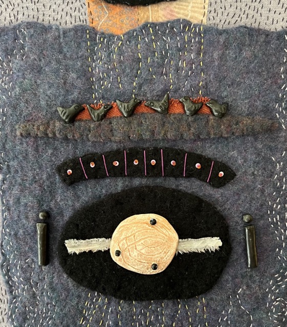 Cotton and silk embroidered Linen, hand designed silk (dye transfer) fabric; antique, glass, ceramic, heishi, and barro negro beads; wet-felted wool; painted bisque ware. Framed 11.25”w x 30.25”h x 1.5”d