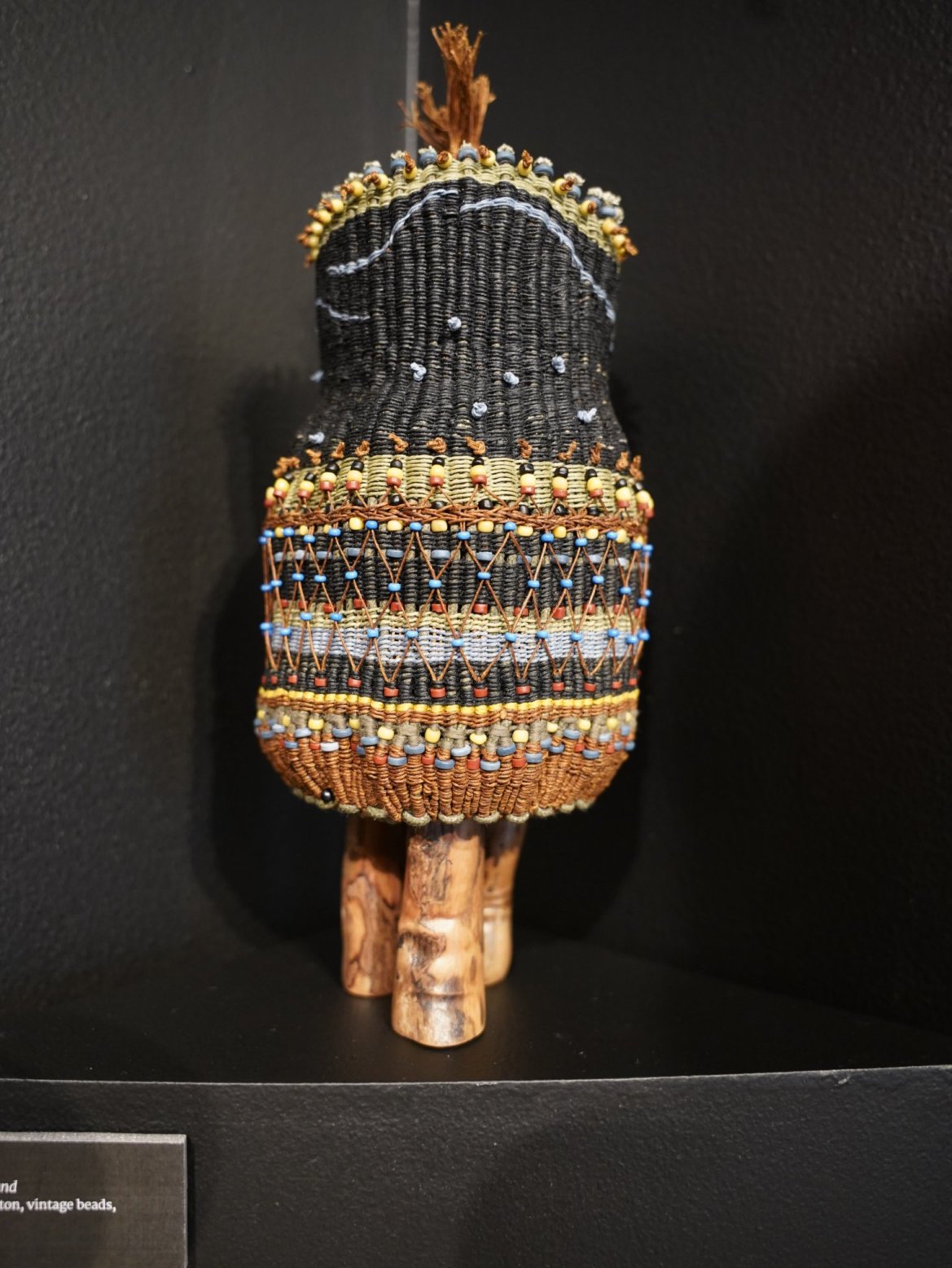 Waxed linen; cotton cord; glass, antique and stone beads; driftwood 13.5”h x 6”dia