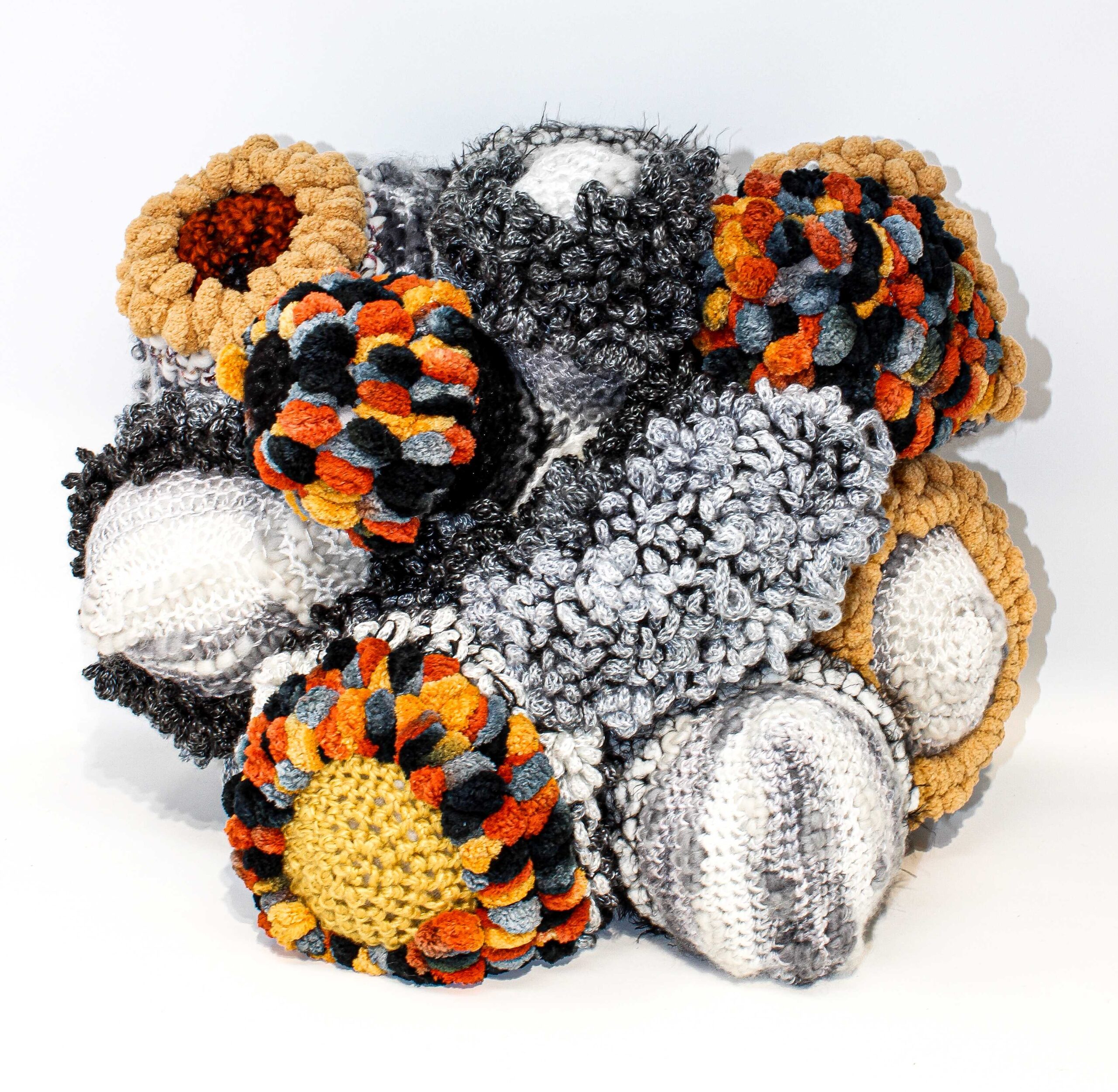 "Grey Anemone" an artistic representation of natural marine elements. These elements of the sea and land (corals, anemones, starfish, shells) are seen through a magnifying glass and reinterpreted through textile sewing techniques - knit and crochet. Although these techniques are very traditional, the way they are applied results in an initial surprise where there is a confrontation between the tradition present in the techniques and the innovation of form, aesthetics, textures and color - and in this clash, the pieces build a dialogue with those who see, touch and feel them.