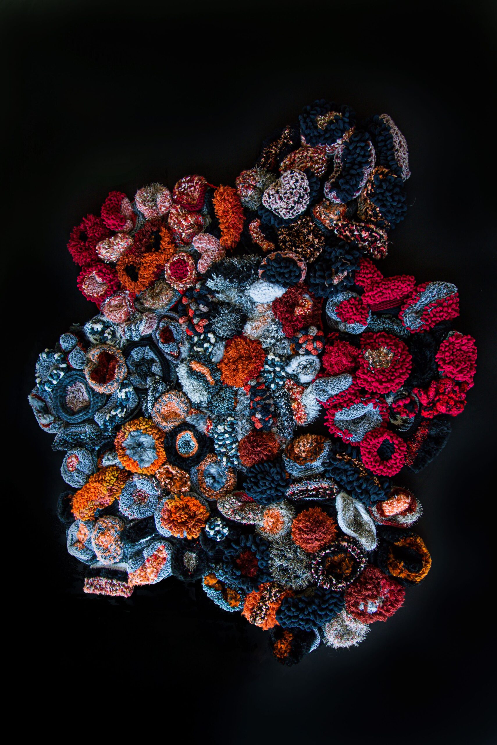 “Fading Luminescent Corals” is a textile sculpture, inspired in the natural luminescent corals. With orange and coral tones that represent the living corals, the grey parts are representing the dying corals in nature. These corals have natural luminescent and they are found at greater depth in the oceans. Also represents an important warning about the human presence and destruction that we represent for planet Earth and other living beings. It belongs to the series “Things from Nature”, a general theme that connects my textiles sculptures since 2016.