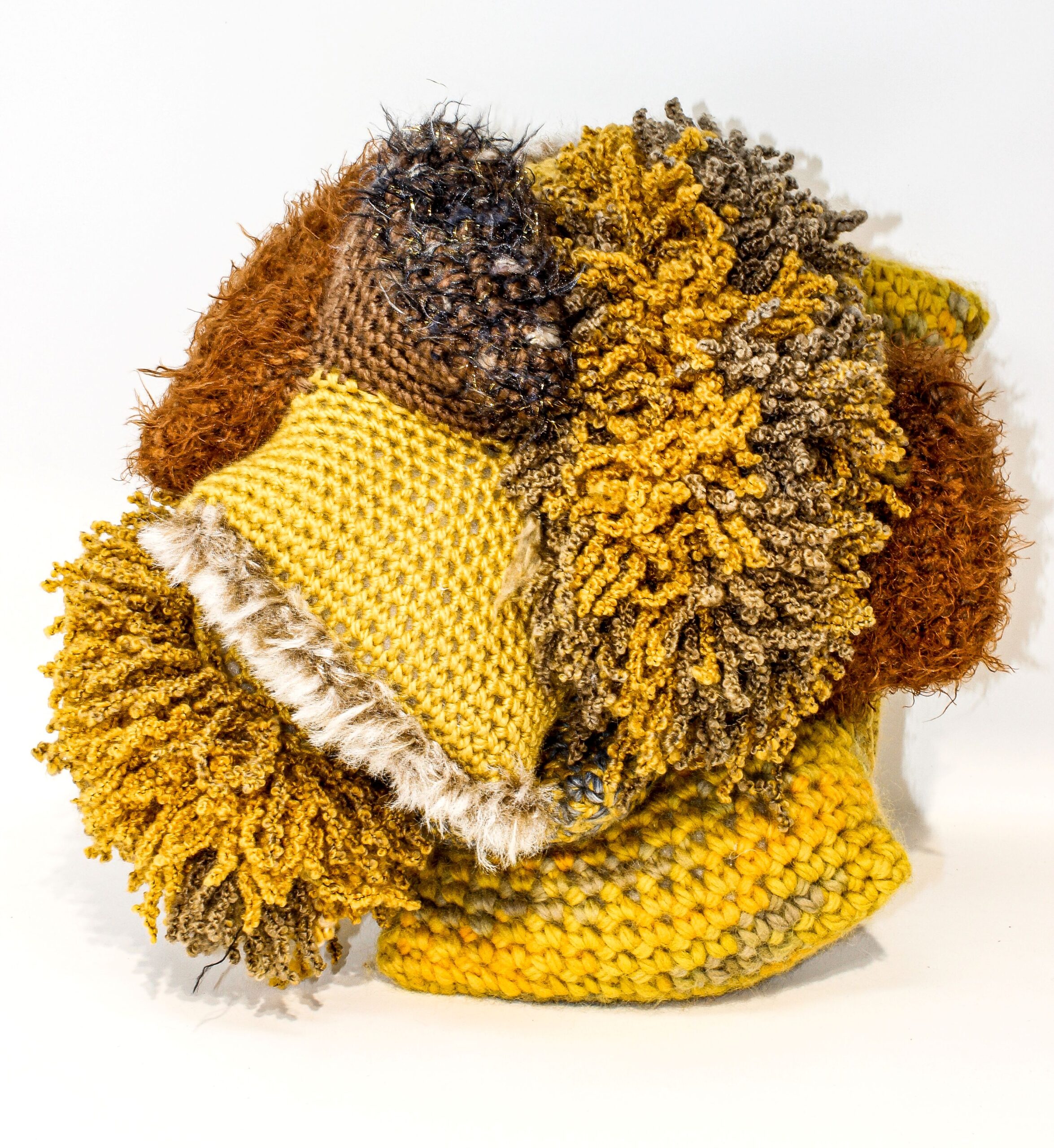 Wool, polyester, acrylic, polyamide yarns, upcycled copper (for the internal structure), 110cm x 100cm x 15cm (approximate)