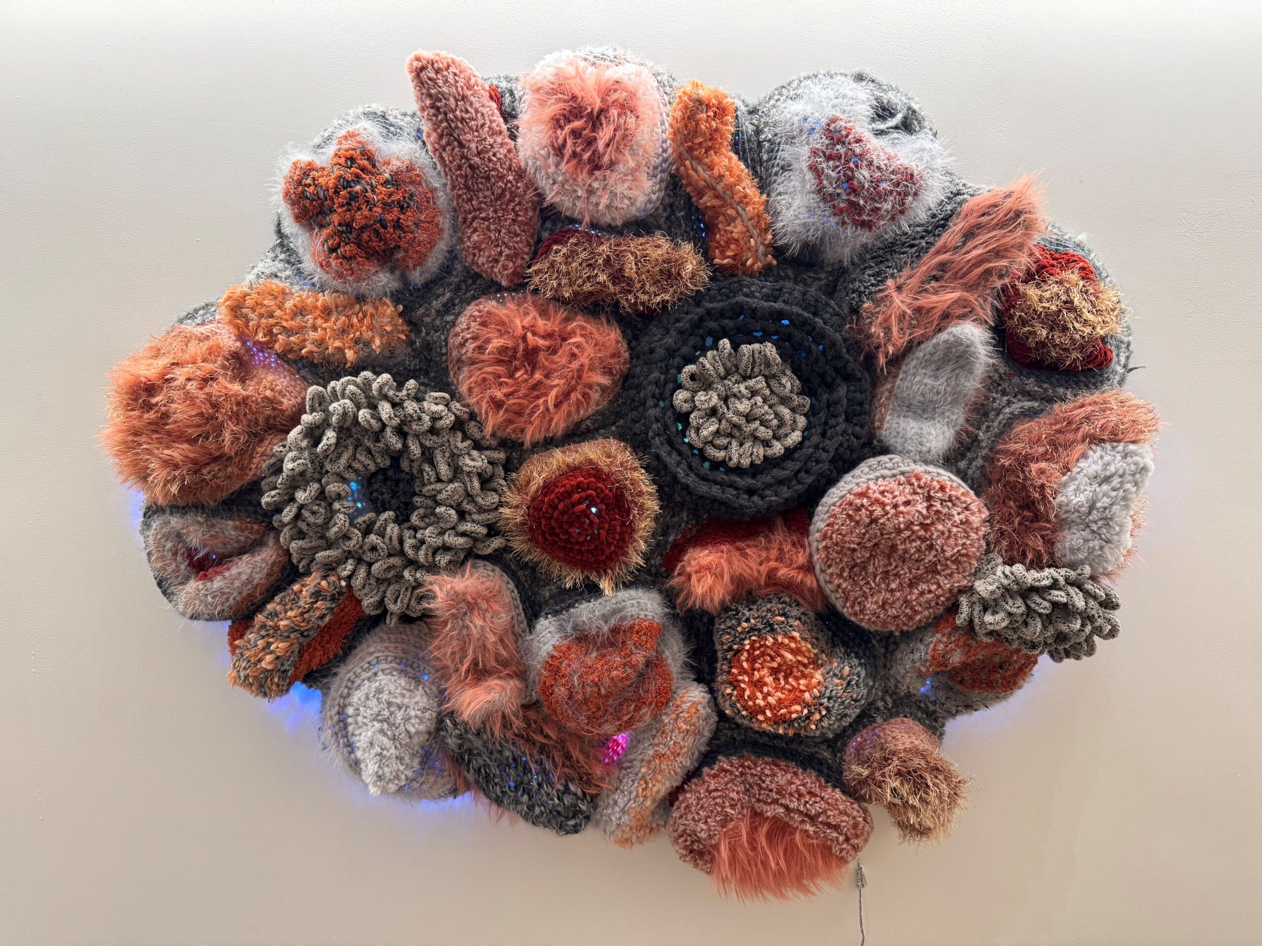 Wool, polyester, acrylic, polyamide yarns, upcycled copper (for the internal structure), LED lights and electrical connections, Recycled polyester net (back of the sculpture) 120X130X20cm