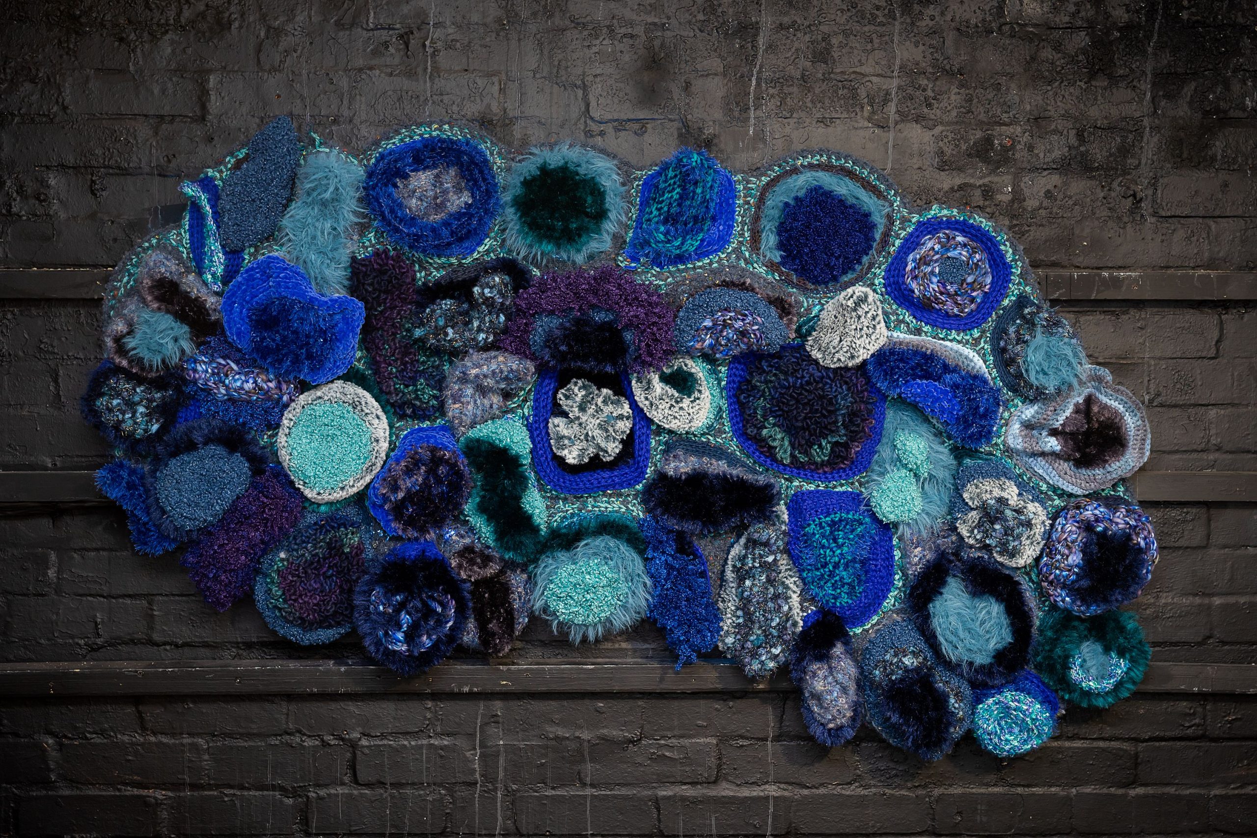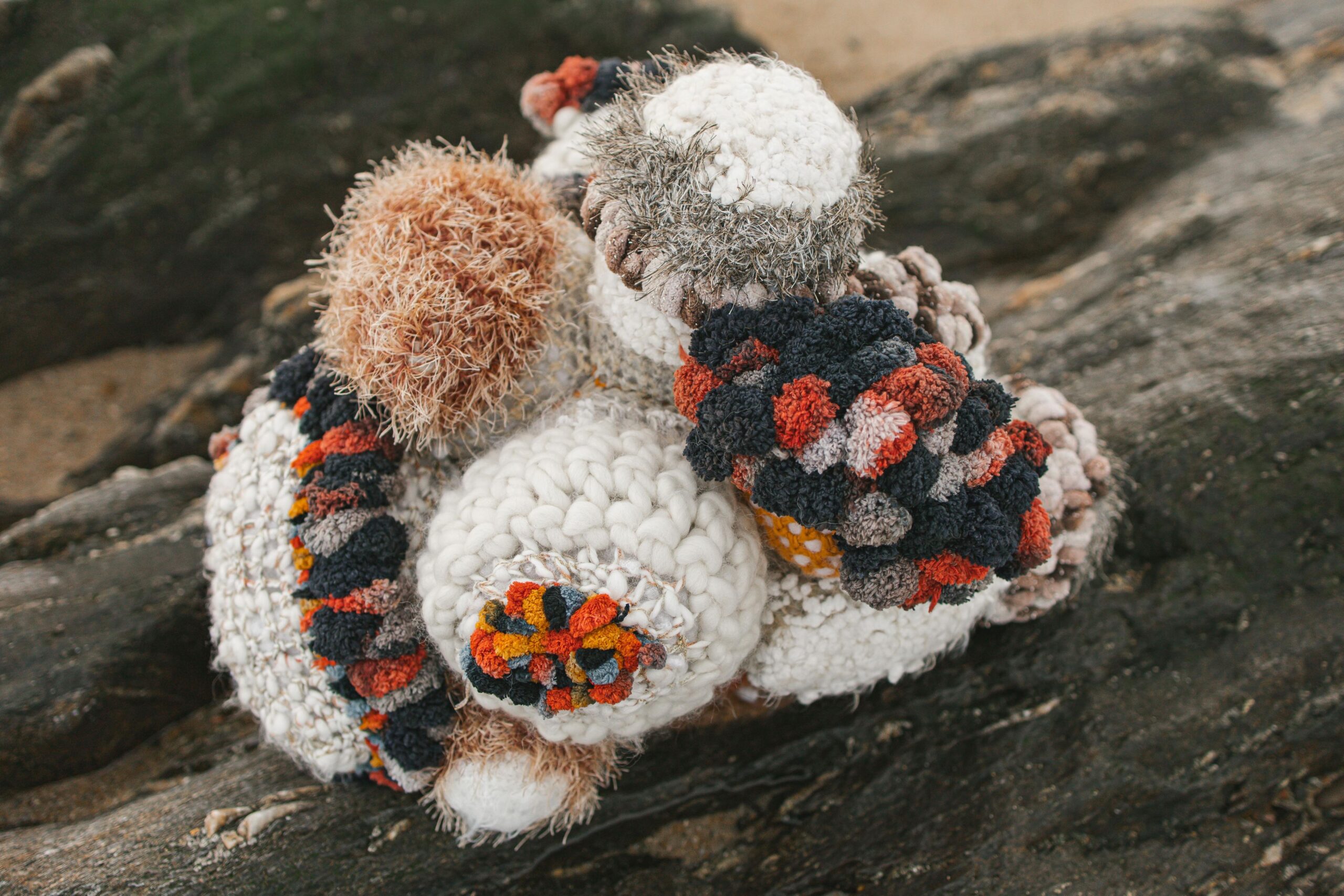 The “Anemones in volcanic rock”, is an artistic representation of marine natural elements. These elements of sea and land (corals, anemones, starfish, shells) are seen through a magnifying glass and reinterpreted through textile sewing techniques – knit and crochet.