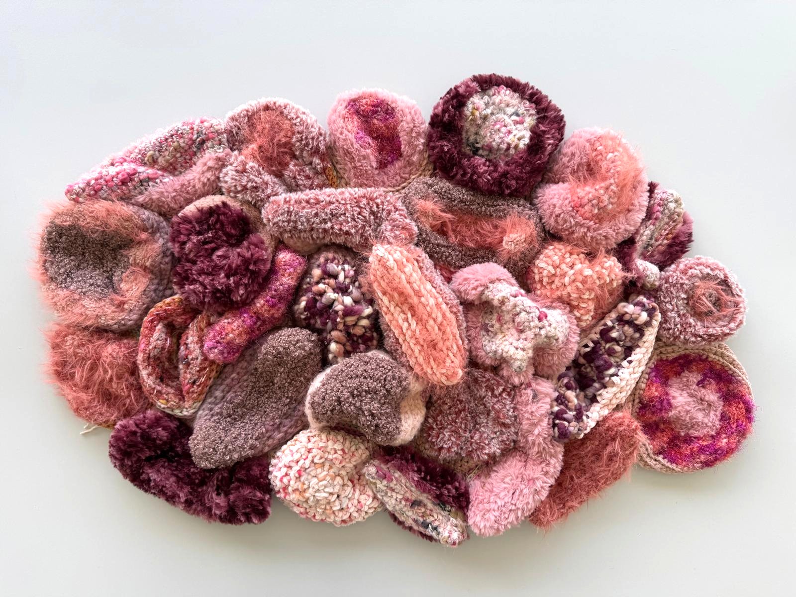 Inspired by the rare beauty of pink coral, this textile sculpture captures the fragile elegance of ocean life through the intricate language of crochet. Using soft gradients of pale blush, warm salmon, and coral rose, each thread is carefully chosen to echo the natural hues of angel skin coral, found in places as diverse as the South Pacific, the Mediterranean, and deep sea realms like the Endless Pink Coral Forest. The layered crochet technique mimics the branching, undulating forms of coral reefs, creating a tactile experience that invites touch and closeness. By building clusters, folds, and spirals, the piece evokes the living texture of coral colonies—delicate yet resilient. This sculptural work transforms yarn into a vivid, almost breathing surface, where color and form combine to suggest both depth and vulnerability. "Pink Corals Reef" is not only a visual homage to marine beauty, but a sensual one—drawing viewers closer with its softness, complexity, and dimensionality. The urge to touch becomes an emotional gesture, echoing the human longing to connect with nature. Through craft, texture, and form, this piece celebrates the silent poetry of the sea’s most precious architectures.