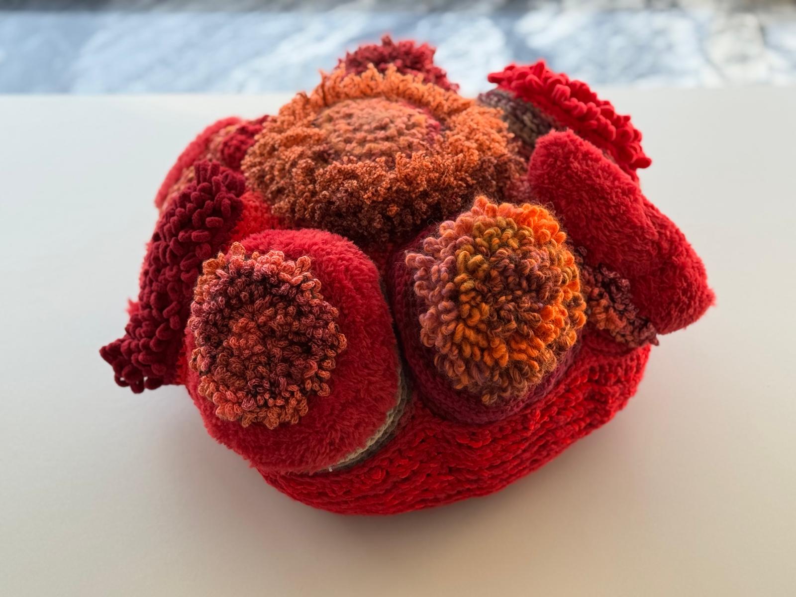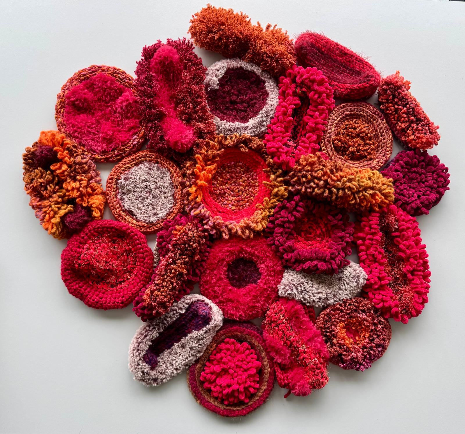 Red Corals Reef is a tactile textile wall sculpture—an invitation to see with the hands and feel with the heart. Inspired by Corallium rubrum, the endangered red coral of the Mediterranean and Atlantic, this piece pays homage to a vanishing marine forest by reimagining its delicate forms in fiber. In mythology, coral is steeped in wonder. It was born, the Greeks said, from Medusa’s blood, turning to stone as it touched the sea. Romans believed it guarded children and healed venomous wounds. These stories remind us that coral has always stirred awe—not just for its colour or form, but for its spirit. Here, coral is reborn in soft textiles—stitched, knotted, and layered by hand. Visitors are invited to touch, to explore with their fingers the textures and rhythms of the sea without harm. This wall piece becomes both a sensory landscape and a quiet act of resistance against loss. By translating the coral’s presence into cloth, Red Corals becomes a space of connection. It asks: can we admire without possessing? Can we remember without wounding? Through touch, this sculpture tells us yes—and offers the enduring beauty of nature not taken, but honoured.