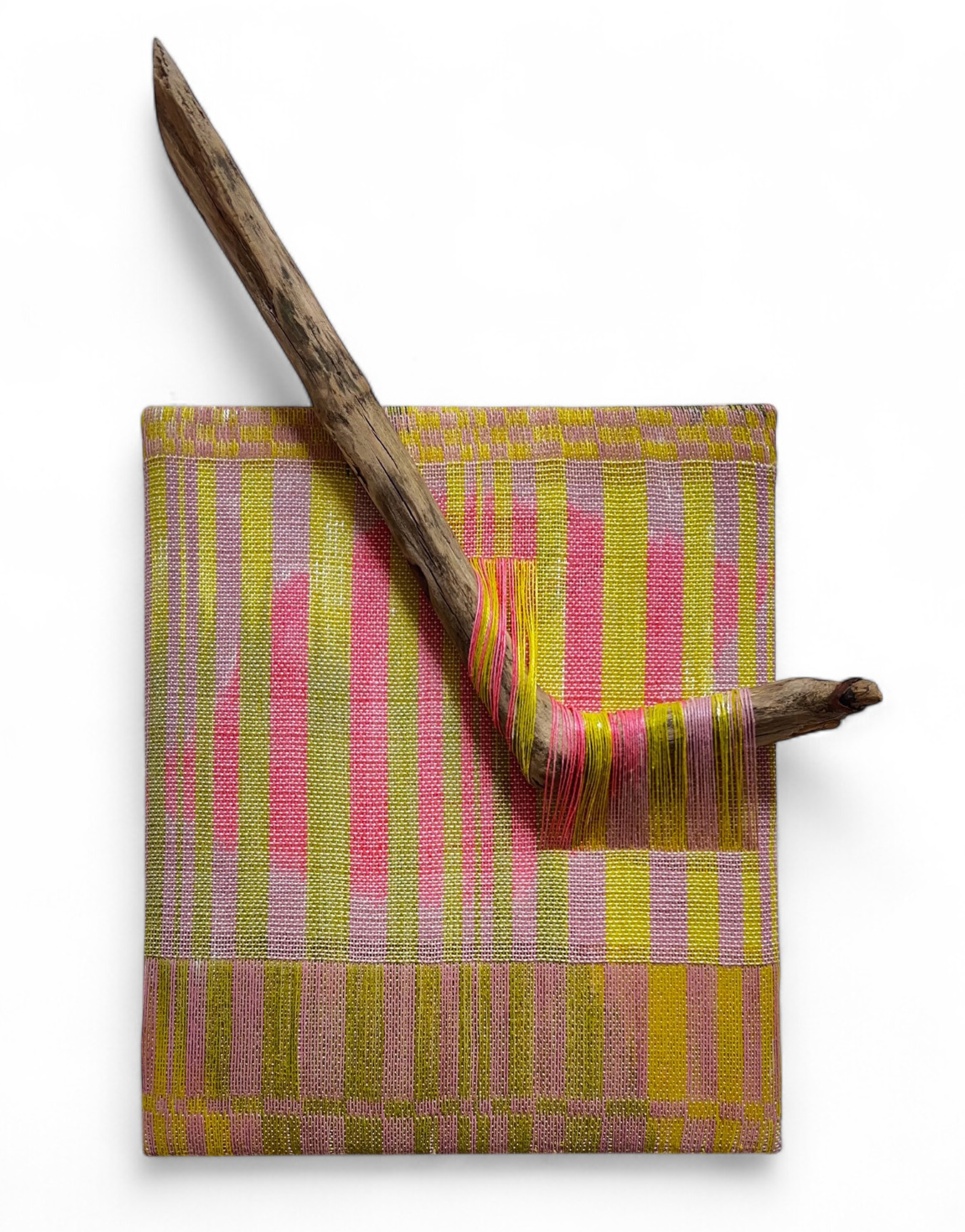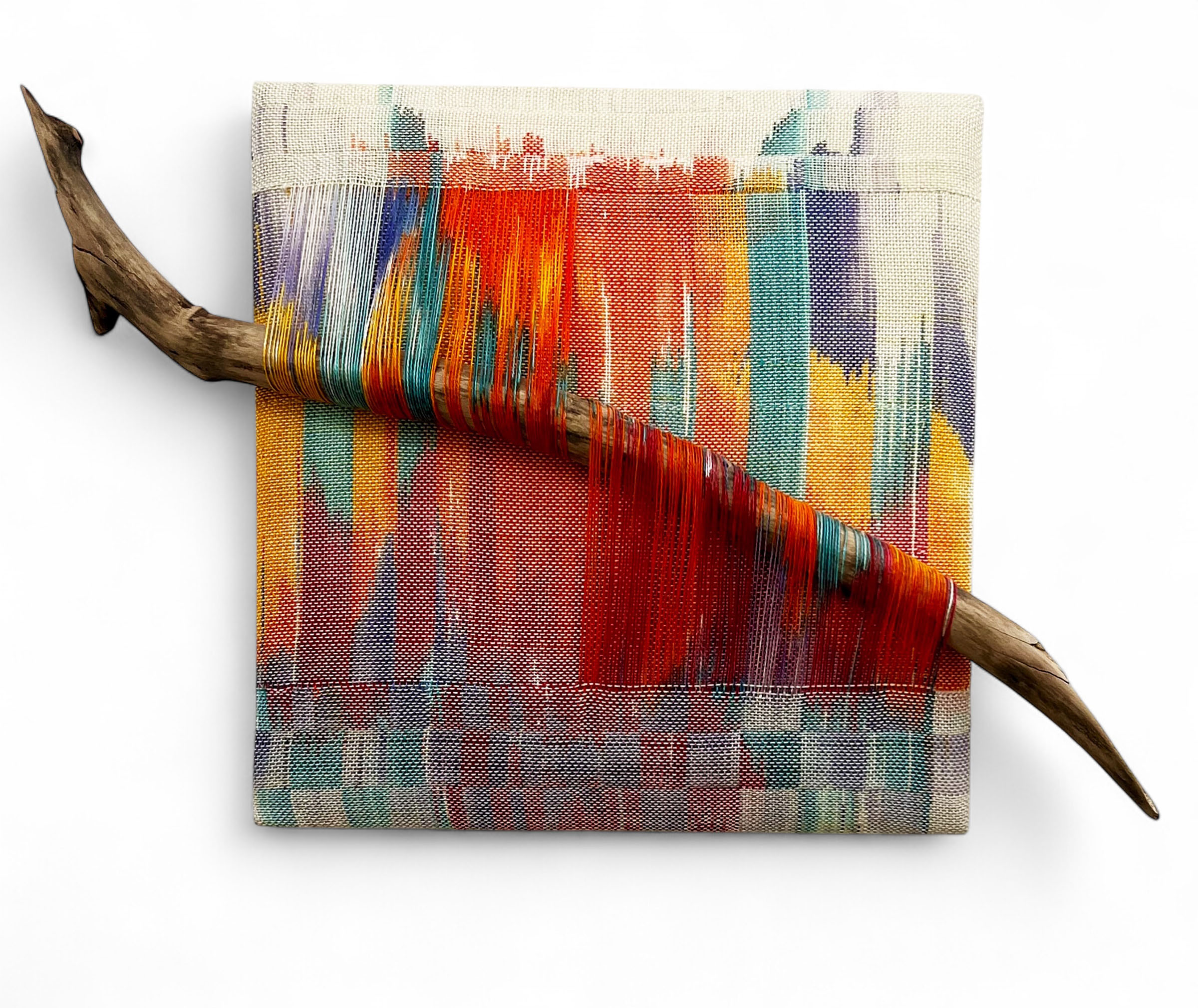 Between Time reflects on the ways we give attention—through caregiving, through maintaining connections, and how it shifts along with our awareness when we gain new insights and understanding. The piece here began as a single painting, but as it was woven, it separated into two panels on the loom. It is a portrait of one of my children, based on a photograph from many years ago. I’ve been especially mindful in this time of how our attention shapes the experiences of children, it makes them feel safe to grow, explore, and begin to understand the world around them. Our attention is a gift—to our own children for sure, but the James Baldwin quote is also often on my mind: All children are Our children, all over the globe.