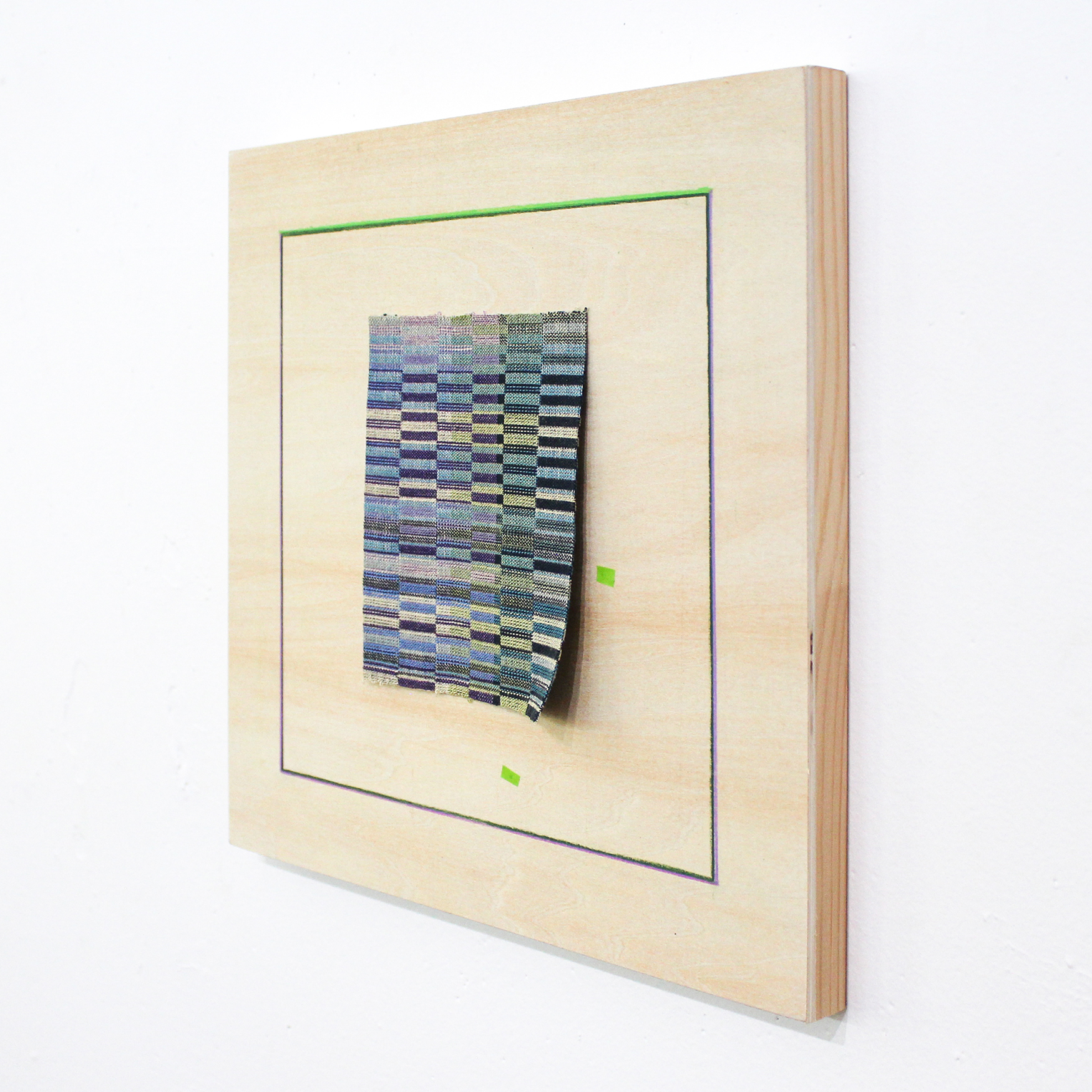 Handwoven stainless steel, silk, and linen, colored pencil, and tape on birch 12" x 12"