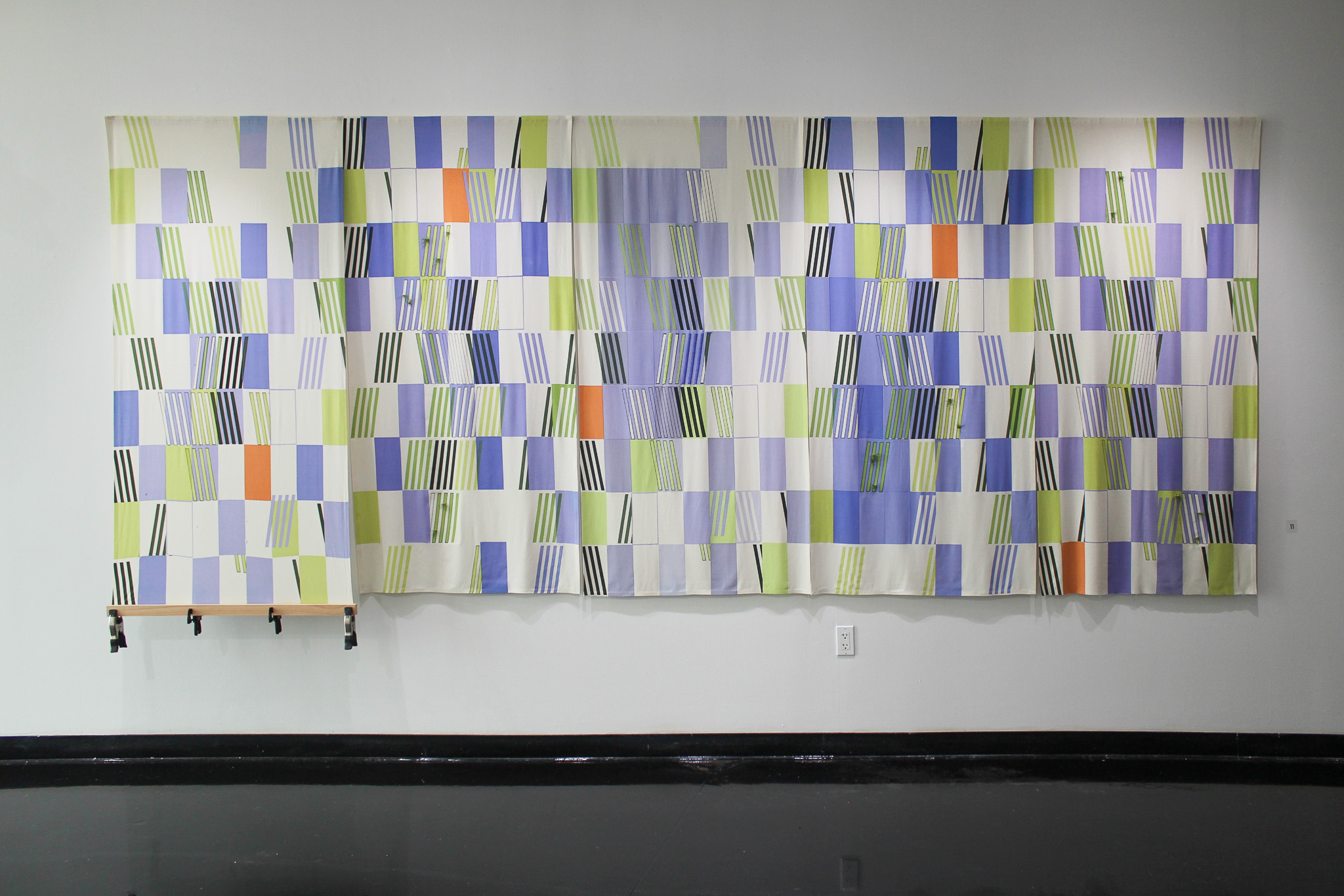 pigment, artificial turf, and embroidery on silk noil, clamps, pine 173” x 70.5” (five panels, 34.5” x 70.5” ea.)