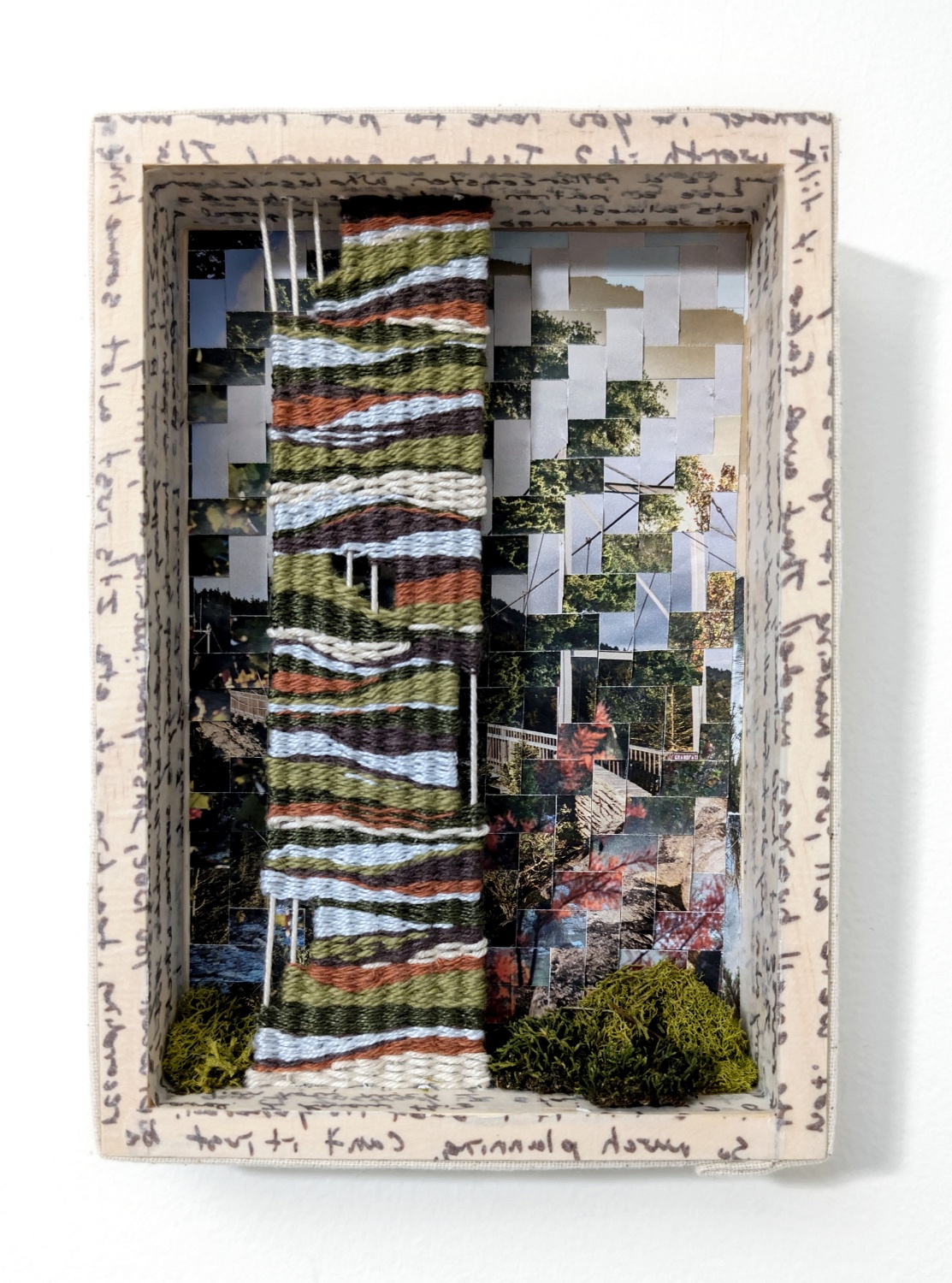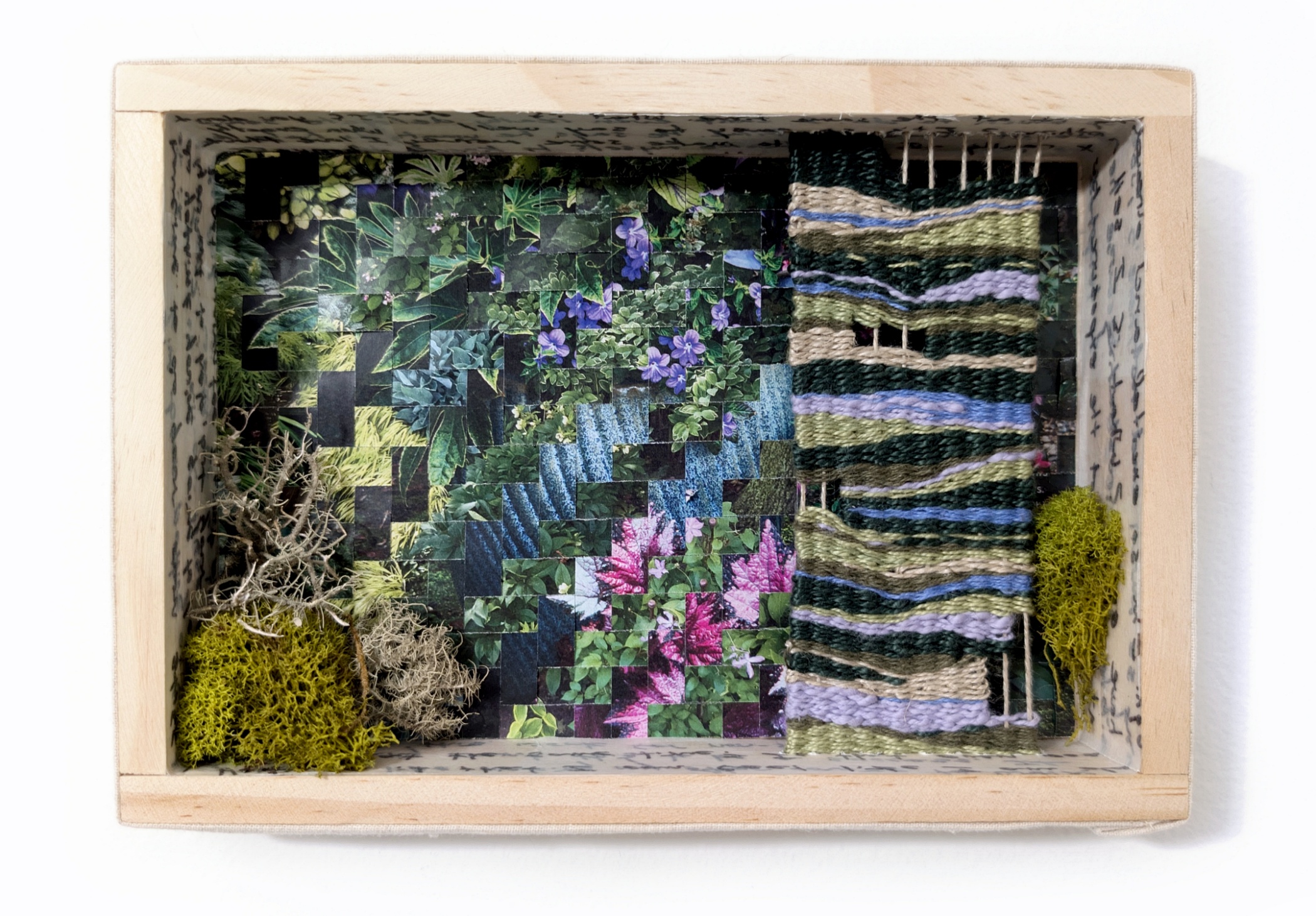Cotton and linen yarn, magazine, transfer paper, wood frame, moss 9" x 6.5" x 1.5"