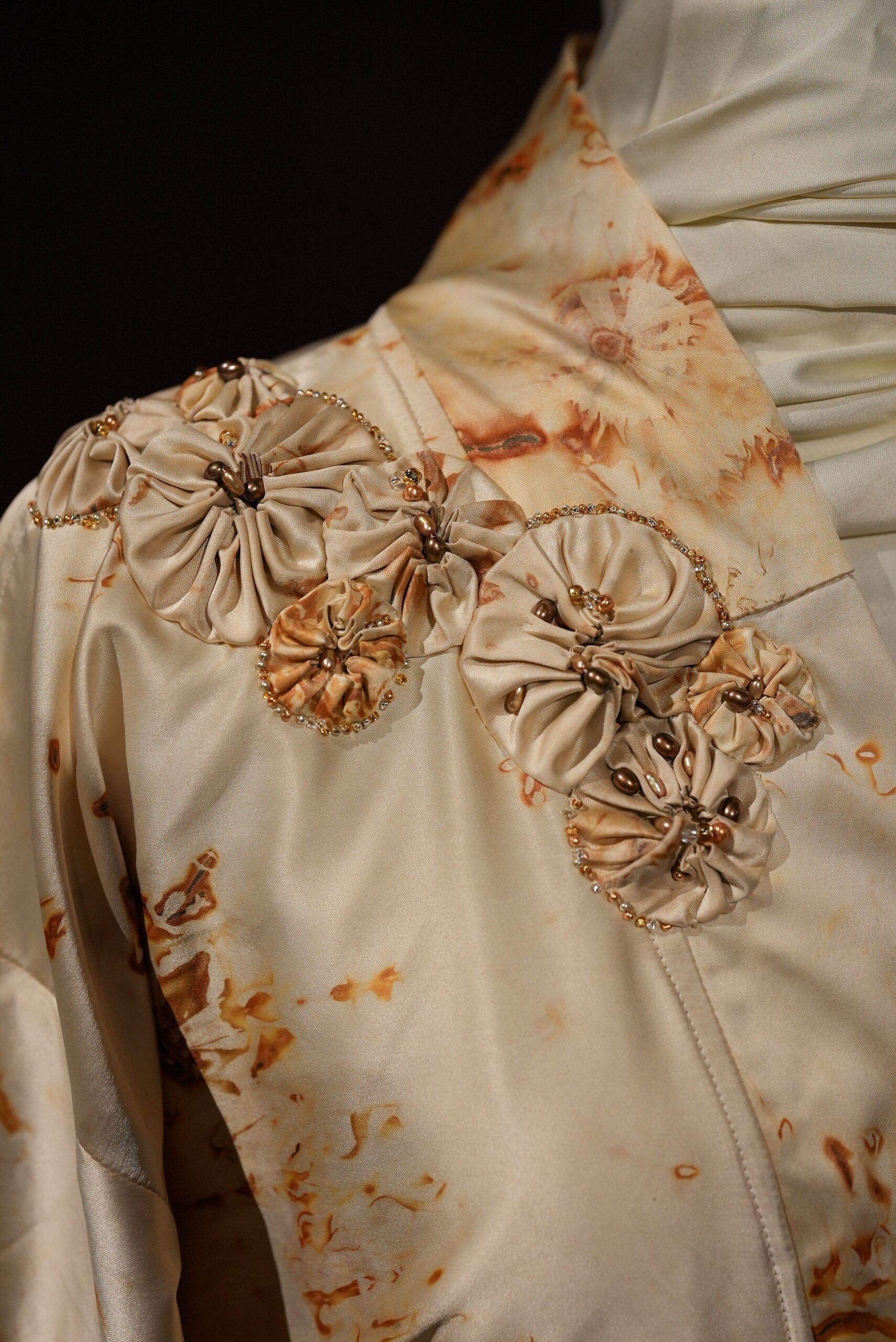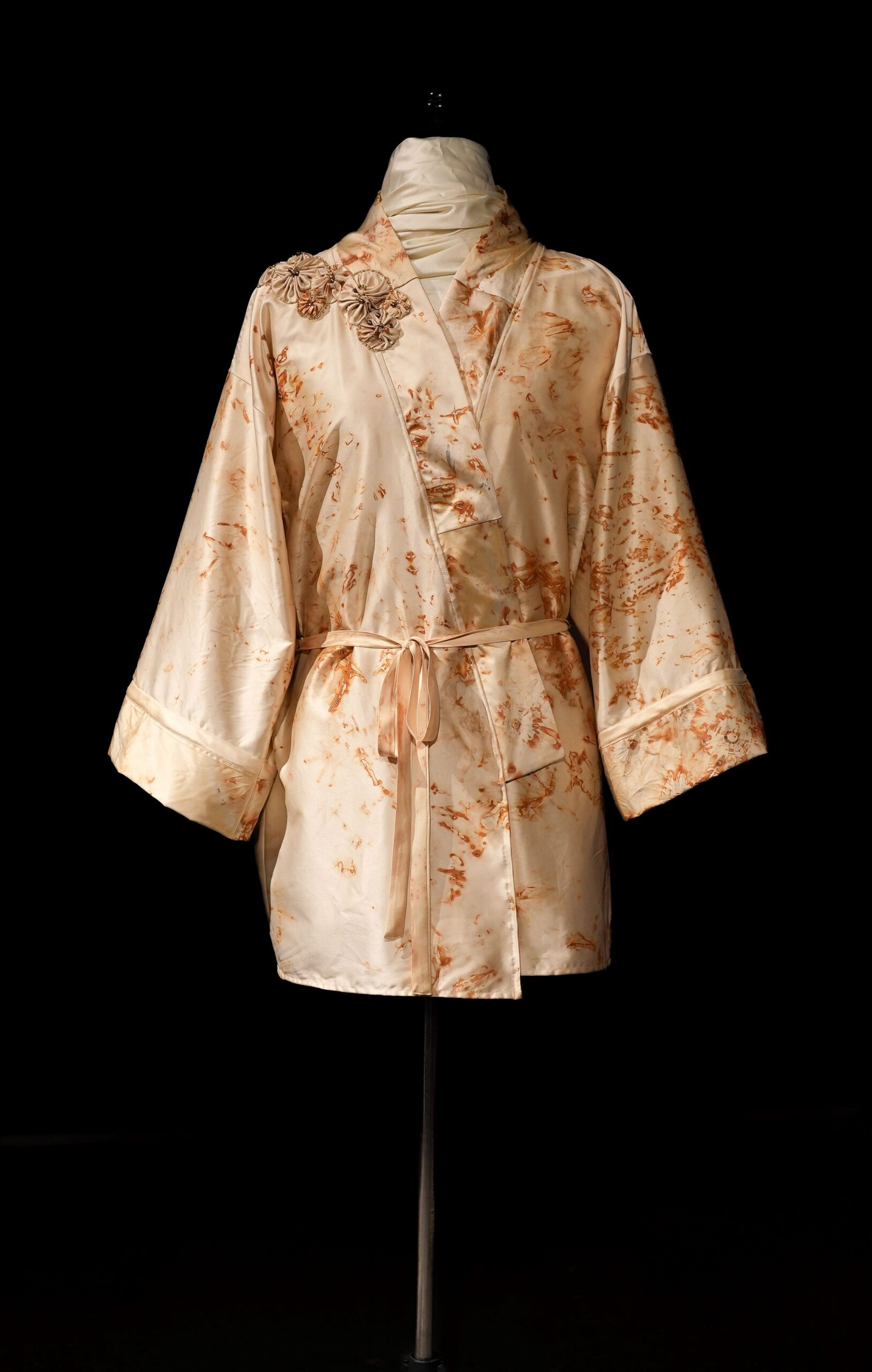 Upcycled 1980s satin wedding dress, shibori dyed with rusty nails, glass beads kimono size medium