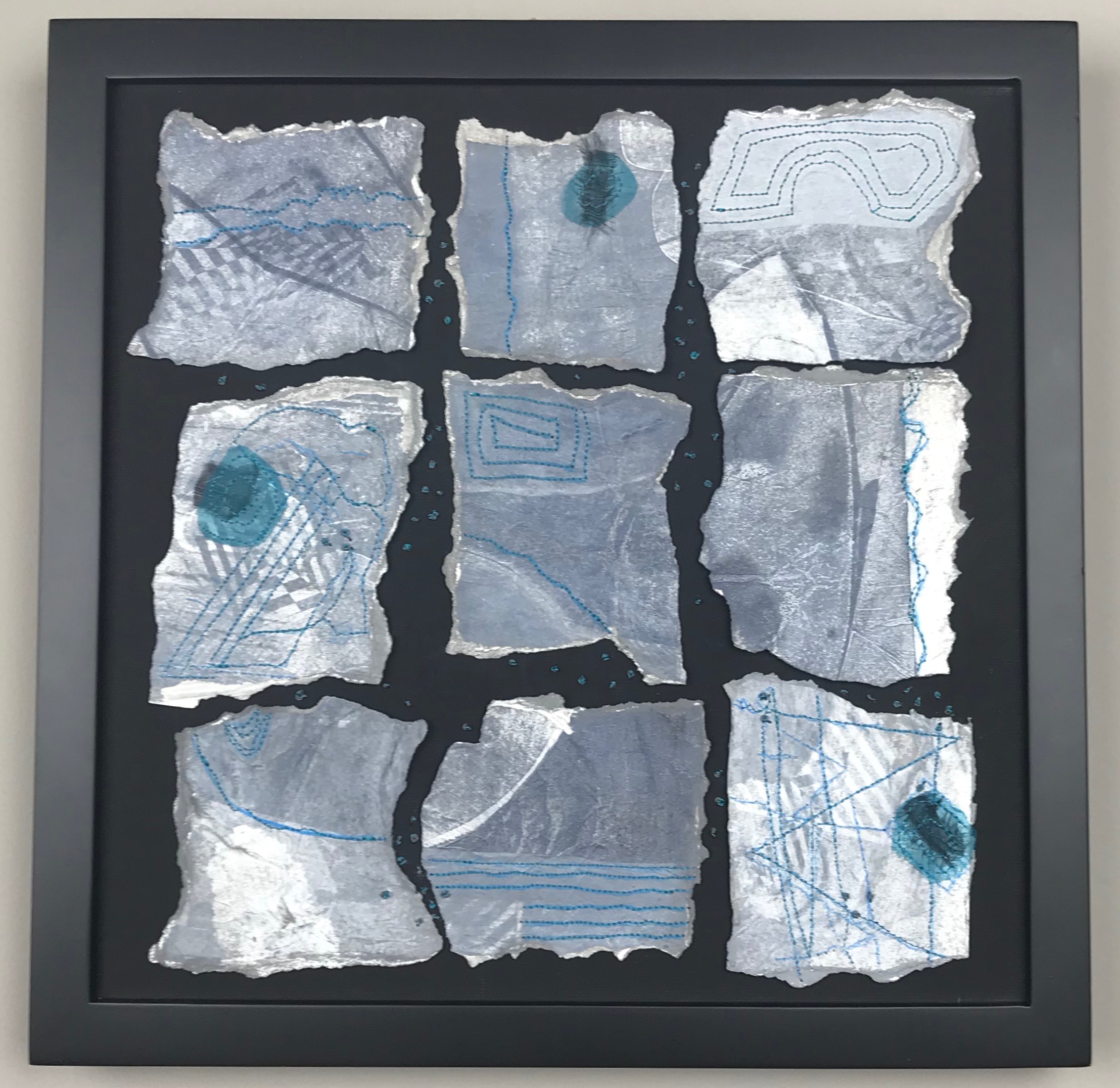 Monoprinted paper, threads, hand dyed silk organza 12 x 12