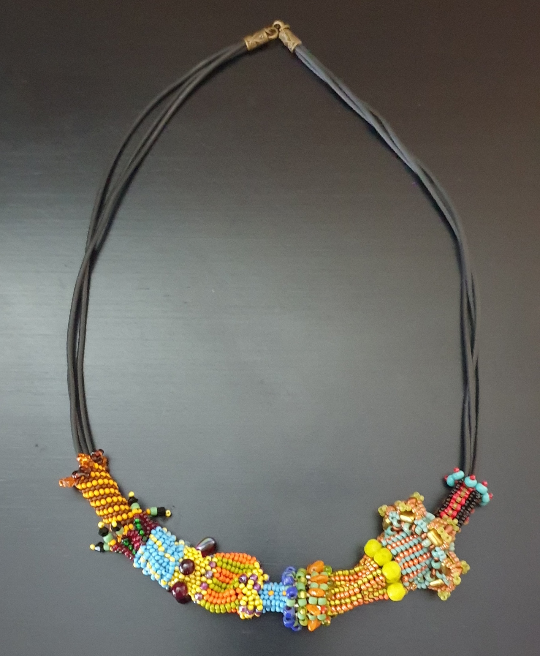 recycled textiles and fibres, glass beads and embroidery thread neckline is 20cm wide