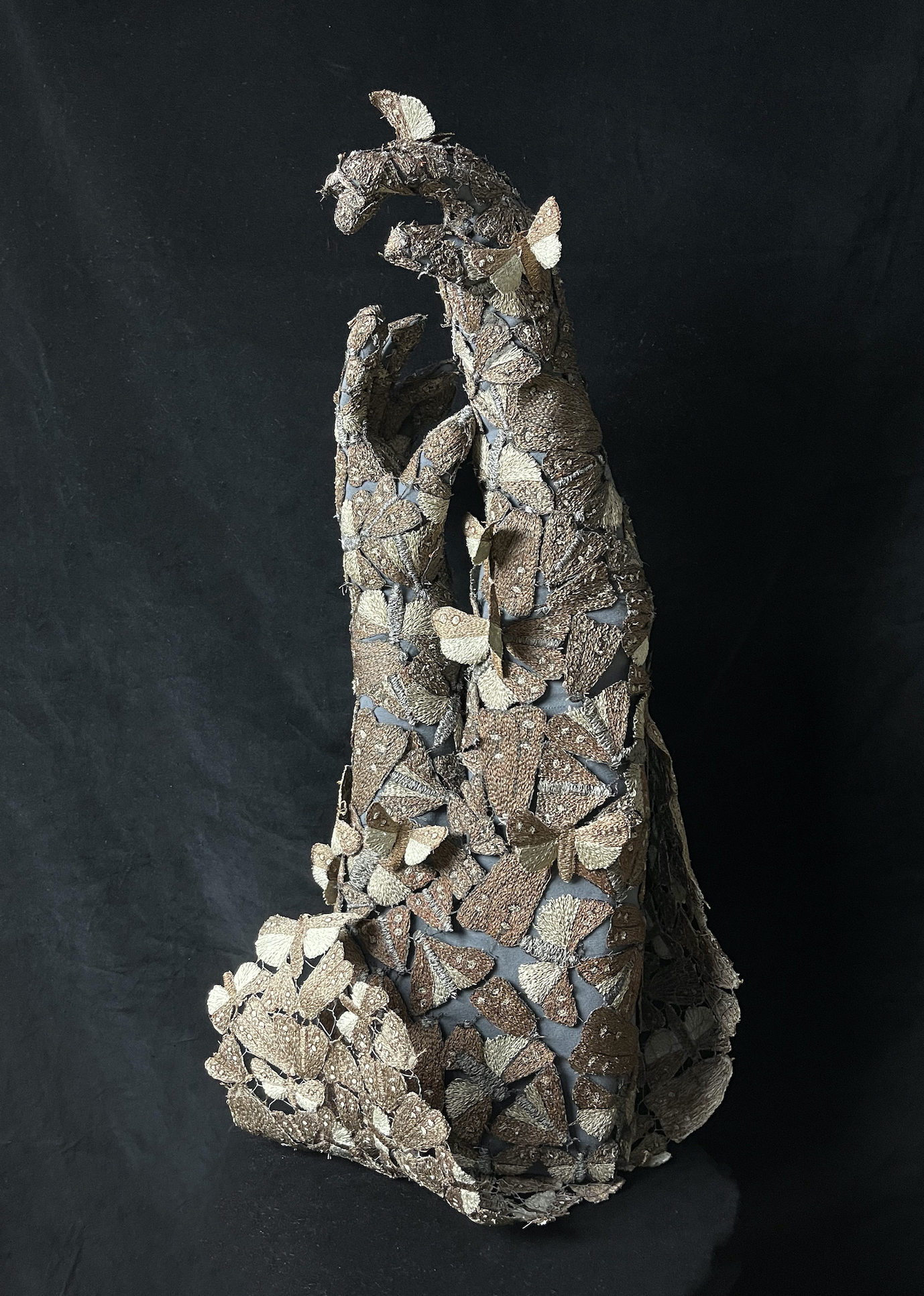 Gardening Gloves: Memories of November Sharon Peoples’ work explores gardens and gardening: the inner secret garden, artists’ gardens, public gardens, and gardens of the imagination. Her ‘garden’ includes the bush reserves, local hills and national parks that she walks. Fragility of both the environment and the human condition is reflected in the medium: stitching, as a metaphor for repair. During the 2020 lockdowns, she worked constantly in her own garden. Her hands are one of the most important organs as a maker. Protecting them from the ravages of dirt with gardening gloves became a daily practice. Soon the gloves became a vehicle for studio work, demonstrating self-care and care of the environment layered with imagery from her regular walks. In December 2021 the bogong moth was added to the International Union for Conservation of Nature’s Red List. She has been stitching bogong moths into lace-like ‘gardening gloves’ commenting on the astonishing estimated 99.5% decrease in the migration number of the moths, as they pass from Queensland, Australia through to the high country in the south of the country in November. She misses the evening fluttering on the windowpanes as the weather warms towards summer.