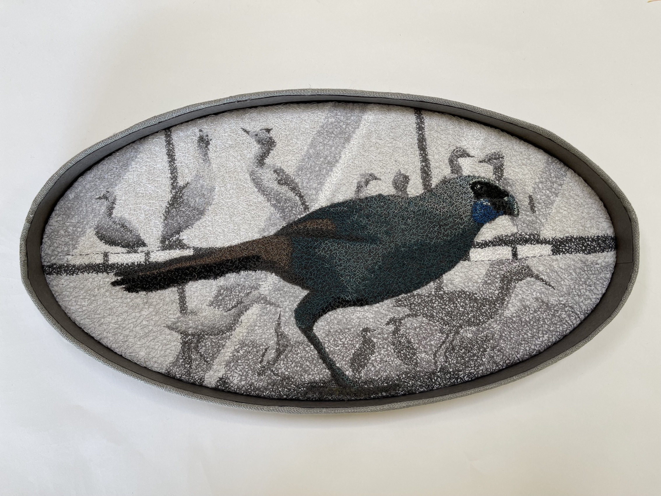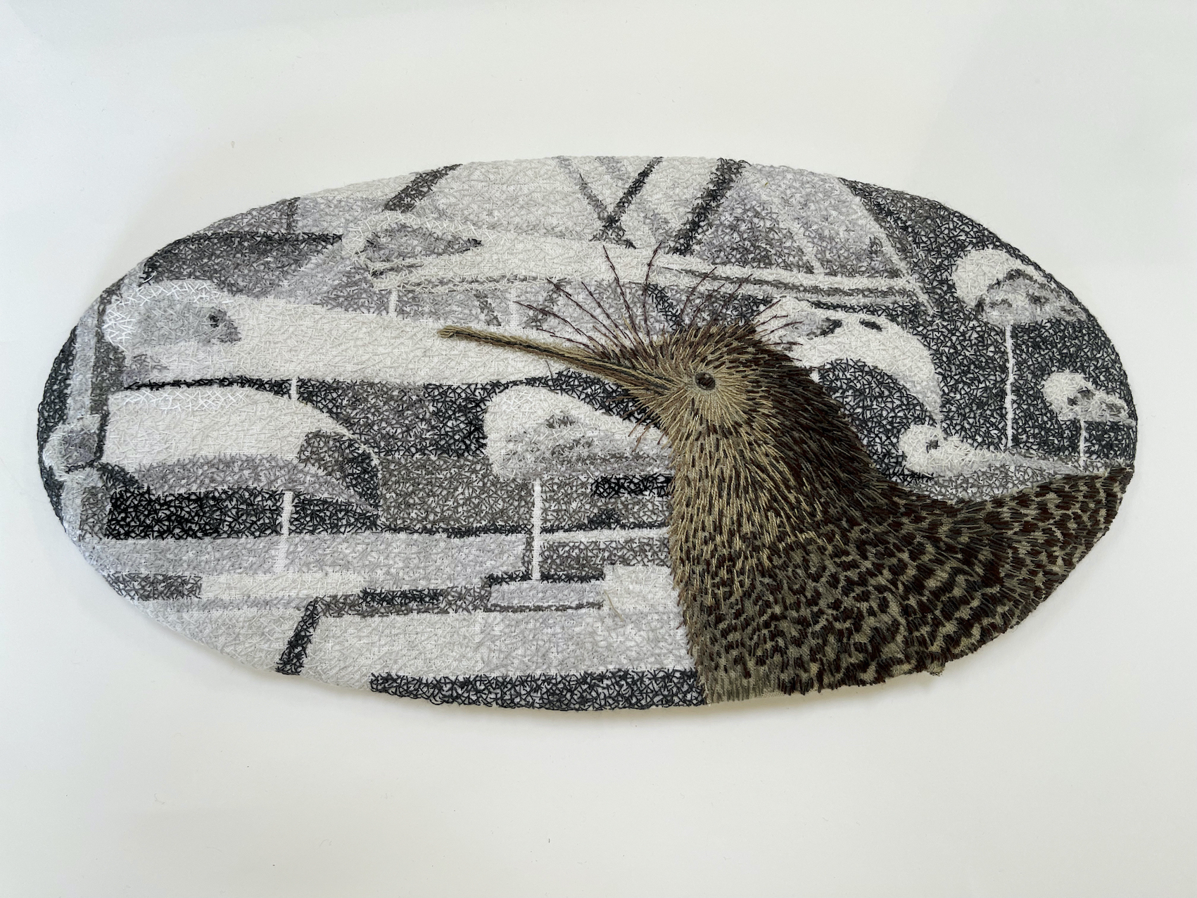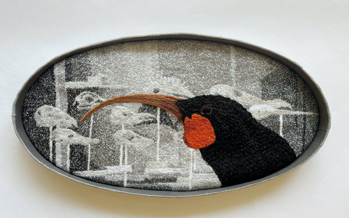 Sharon Peoples spends much time wandering and wondering about gardens. It’s not plants, so much as the ‘visitors’ and the labour of gardening. From her own domestic garden to the local bushland and further afield to surrounding national parks, she is energised and draw inspiration by walking and observing these environments. Through exhibitions and residencies in recent years, she has become interested in how landscapes such as national parks and land holdings are crafted, often by hand, to manage nature and how conditions need to be manipulated and ‘gardened’ in order to not lose such environments. Although birds have long been a motif in her work, they have become much more central to her thinking and an important constituent to my stitching. In Sharon’s travels through the ‘garden’ of New Zealand, her response has been birds and their environments. The work focuses on threatened birds, encountered both in nature and in museums in New Zealand. This investigation combines her background in museum studies with her concerns of the environment. Fragility of both the environment and the human condition is reflected in stitch as a metaphor for mending the environment. The hand stitched works go beyond a literal translation of imagery of birds into textiles. While these are very small works, she has been thinking of very large historic embroideries, such as the Bayeux Tapestry which shows the marks of stitchers, restorers and menders, all of which stand for her, illustrate the repair, care and protection that is required for the environment.