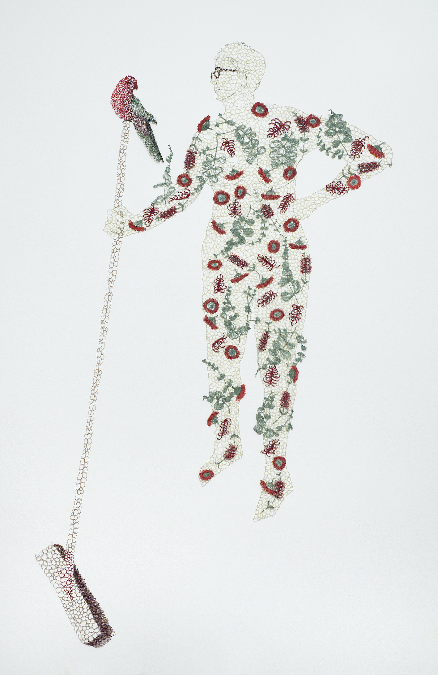 Sharon Peoples explore plants and gardens: the inner secret garden, artists’ gardens, public gardens, national parks as gardens and gardens of the imagination. Her ‘garden’ is the areas she walks – the local hills and national parks. Fragility of both the environment and the human condition are reflected in the medium: the stitch. In thinking of very large historic embroideries, such as the Bayeux Tapestry, the marks of stitchers, restorers and menders stand to illustrate the repair, care and protection that is required for the environment. She uses her embroidery as a metaphor for repair. In using the female warrior she explores the continuous battle in the garden in pursuit of ideals of paradise, as noted by eco-feminist Val Plumwood who argues that gardening ideals in Australia are strongly influenced by the twin forces of colonialism and commodification. Home gardens become part of the war against nature.