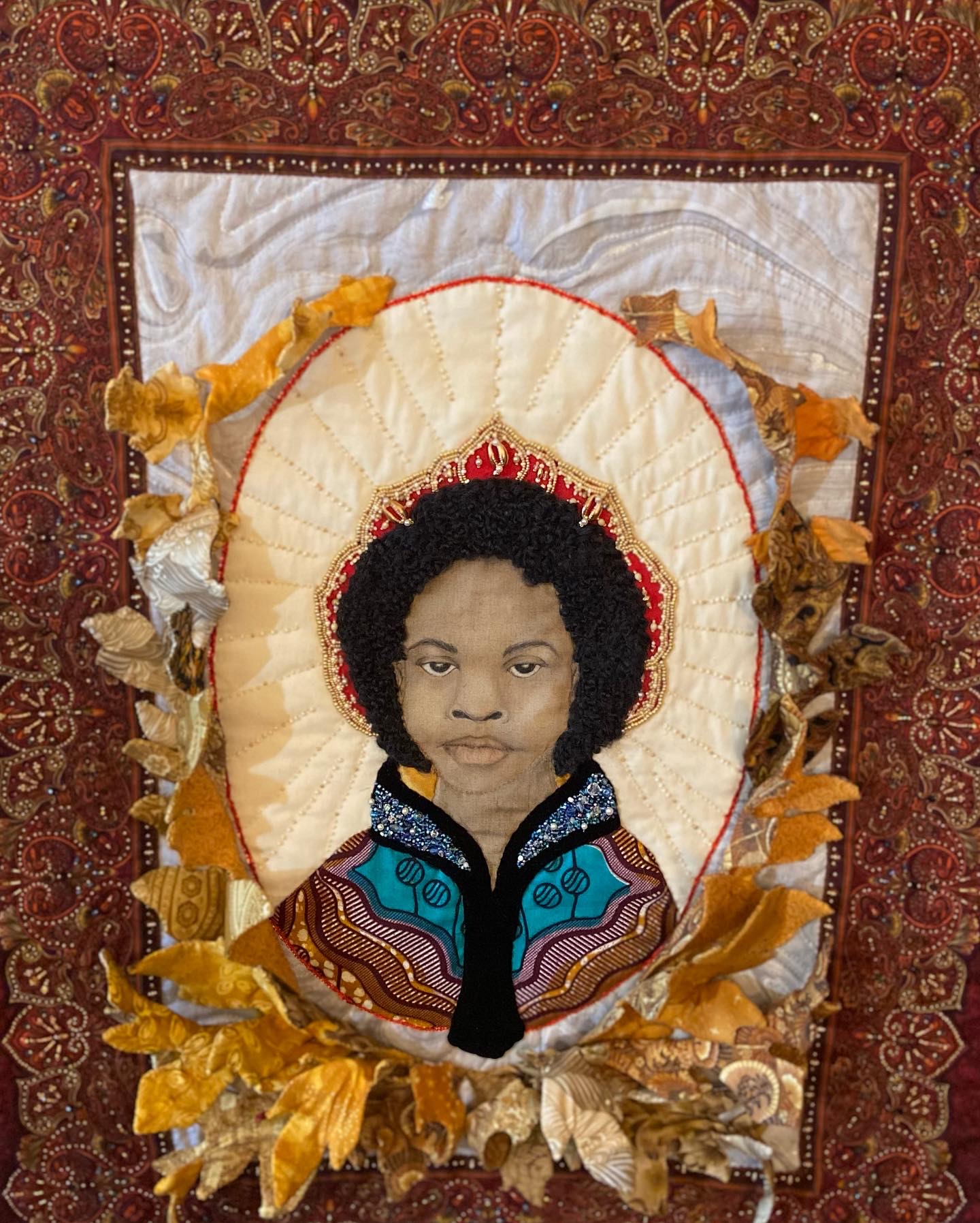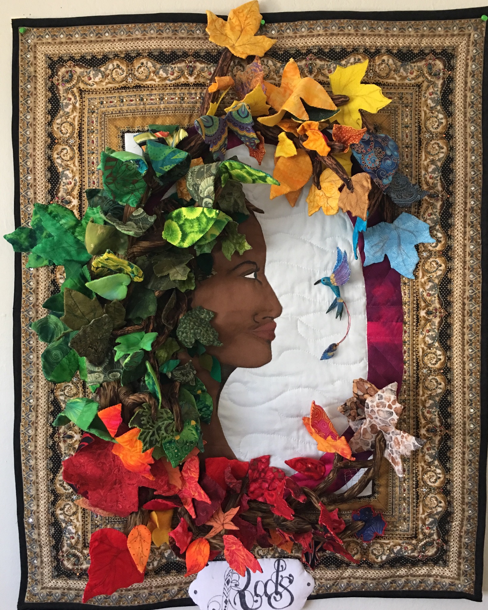 Commercial fabric beads colored pencils dimensional acanthus leaves Quilted with beads 33x32