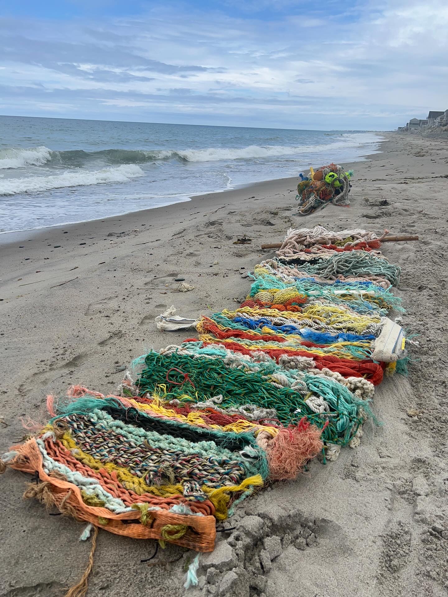 collected marine debris: rope, line and bait bags 96”x24”x2”