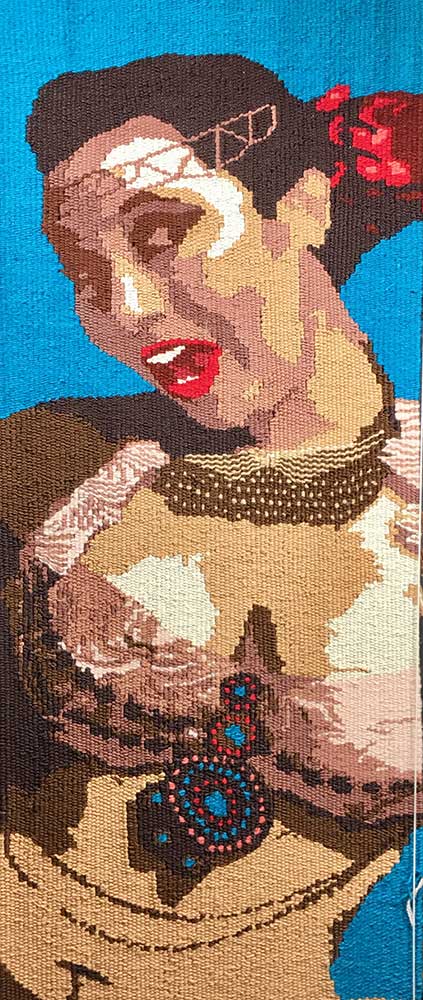 Woman With Red Turban is an early tapestry inspired by a painting. I found the eyes looking off the side intriguing.This has remained one of my favorite tapestries from my early work. This work was a First place finalist in the Niche Awards.