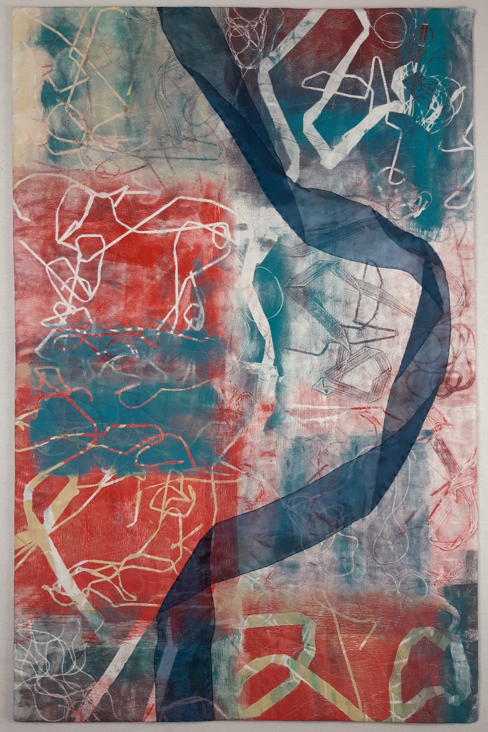 Layered prints convey movement and texture in this wholecloth textile piece.
