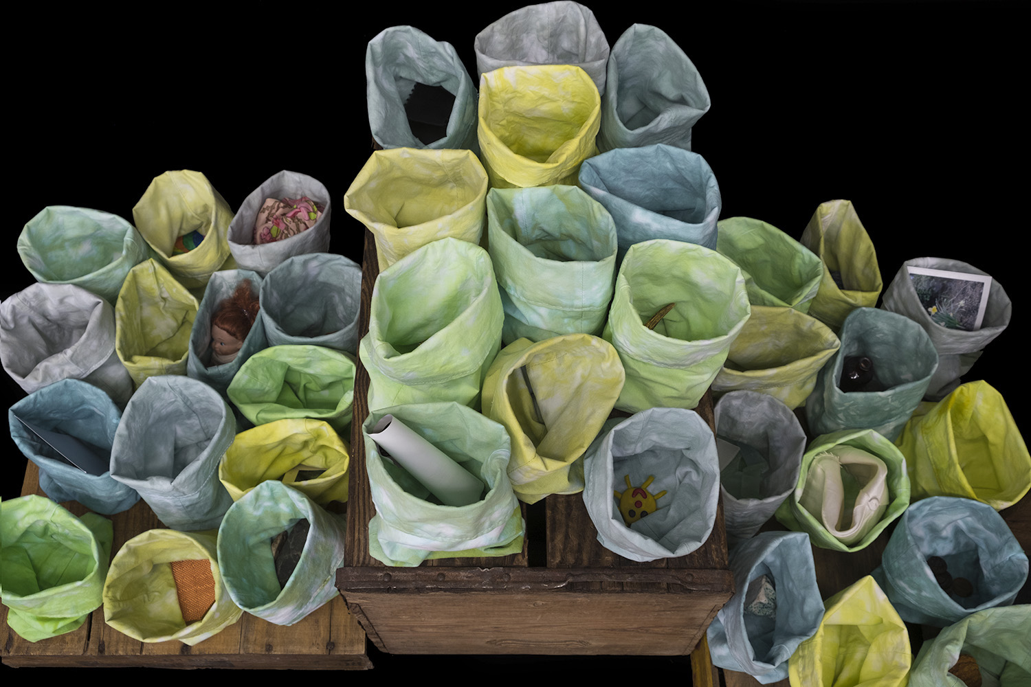 Hand dyed cotton, found objects collected by the artist throughout her lifetime , vintage wooden crates 18” x 48” x 10”