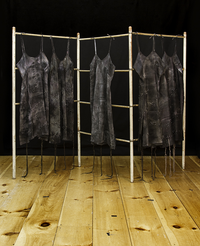 Based on a vintage lingerie pattern from the 1940’s. Hand dyed silk, glass beads, vintage clothes hangers, vintage drying rack. 65”x48”x48”